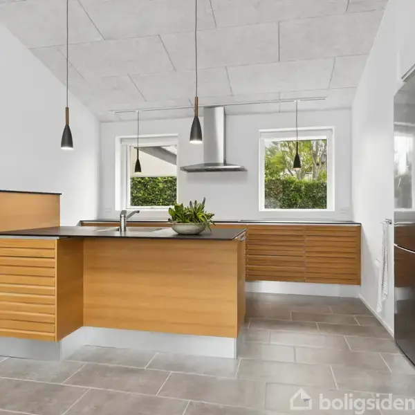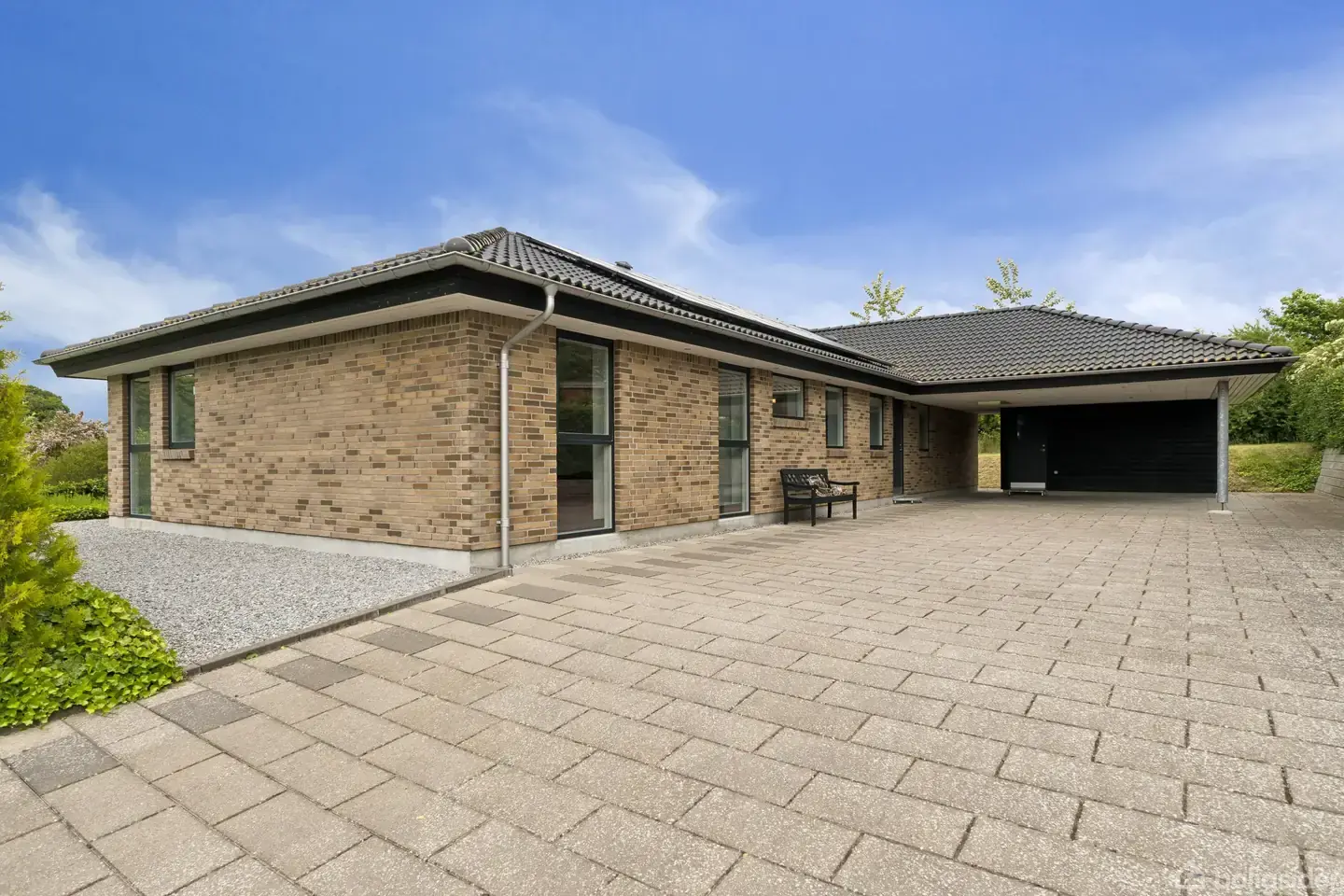 Højtbeliggende nyere vinkelvilla opført i 2018 i brun-flammede sten med valmede gavle og sorte betontagsten, ståltagrender og træ-/alu vinduer/døre - på 1188 m2 praktisk anlagt og vestvendt grund med PANORAMAUDSIGT til bøgeskoven omkring Terndruplund - herigennem sti direkte til skole og idrætscenter med svømmehal m.v.SOLCELLER, LUFT-TIL-VAND VARMEPUMPE, GENVEX ANLÆG, AIRCON OG NILAN VANDRENSNIGSANLÆG - GIVER SUPER BILLIGE DRIFTSUDGIFTER ....Bred og flisebelagt indkørsel til 56 m2 integreret do