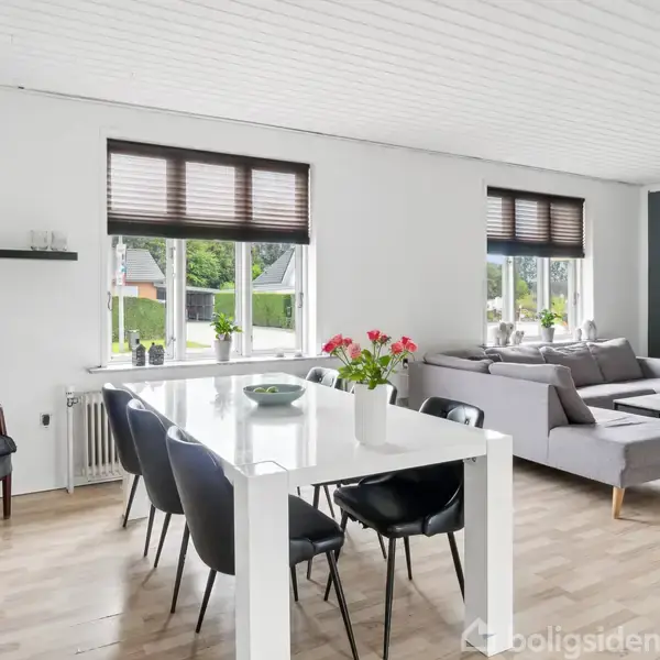 Stor, mulighedsrig villa i PjedstedMidt i Trekantsområdet i det aktive lokalsamfund Pjedsted ligger denne villa, som giver familien mange muligheder, da der er hele 190 kvadratmeter at indrette. Huset er indrettet med store, gode værelser, et badeværelse, et rummeligt bryggers samt en stor stue og et køkken, der er i åben forbindelse. Køkkenet har fået skiftet gulv og loft i 2022. Udenfor er der en overskuelig, vestvendt baghave.Stuen, alrummet og køkkenet hænger sammen, og det er et lyst og beh