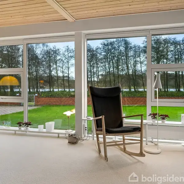 Velkommen til Åglimt 29 – en sjælden mulighed for at flytte ind i et hus, hvor naturen er en del af hverdagen. Her bor du med panoramaudsigt over Engsøen, som breder sig smukt ud foran boligens store vinduespartier. Huset på 183 kvm er indrettet i ét plan og byder på en stemningsfuld kombination af klassisk arkitektur, fantastisk rumfornemmelse og et hjem, der er passet på gennem årene.Et hjem der åbner sig mod udsigtenStuen er husets hjerte – et stort, åbent opholdsrum med brændeovn, biblioteks