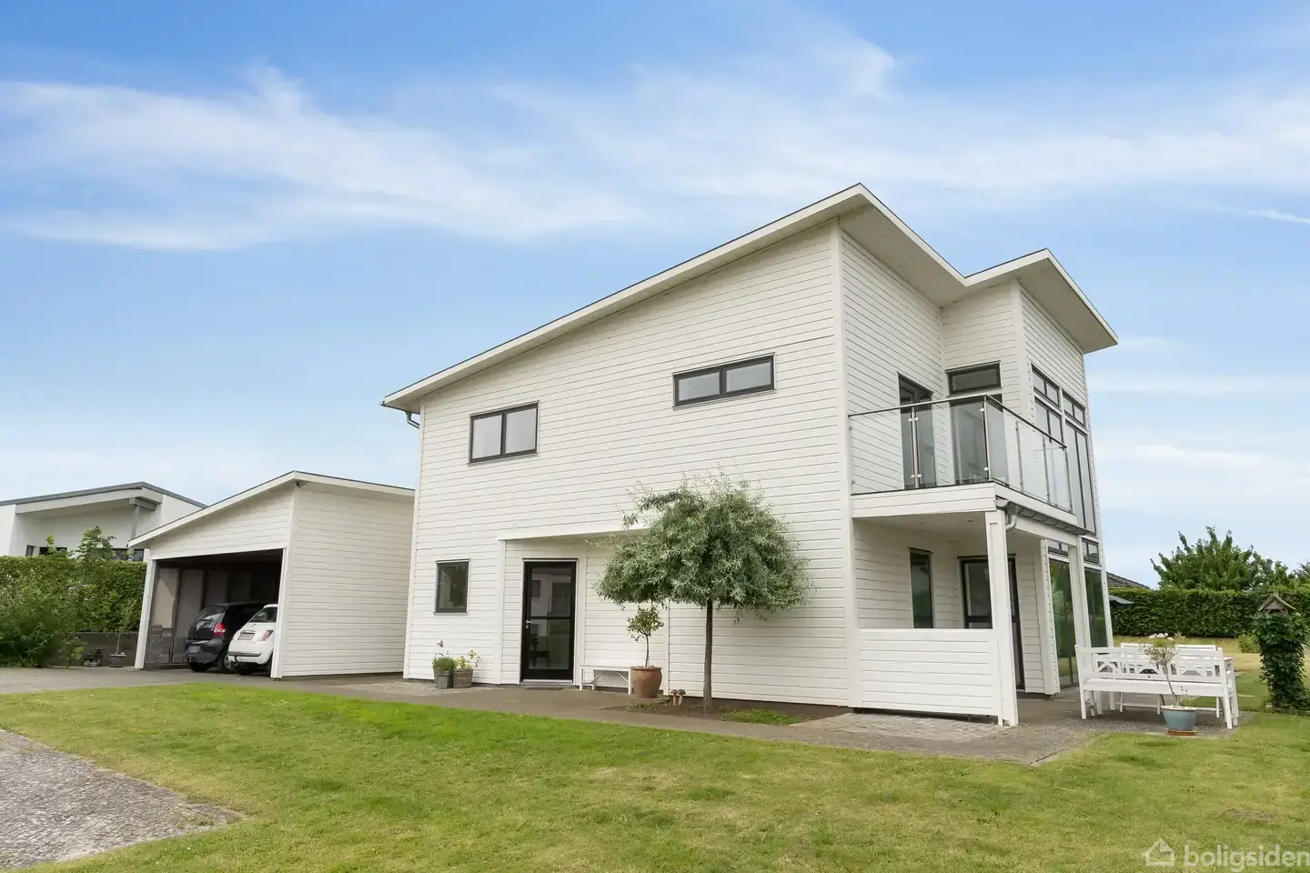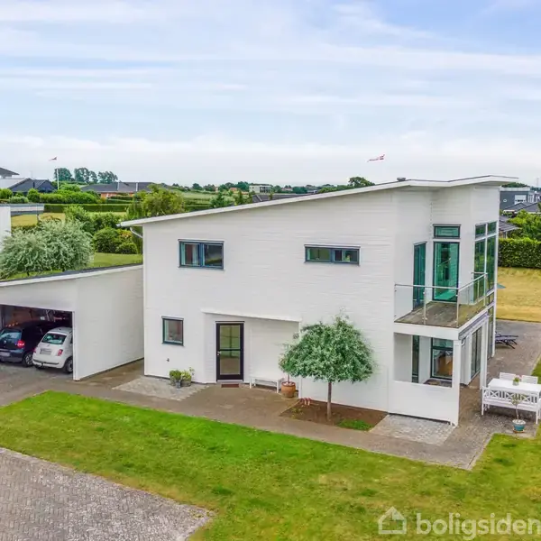 Velkommen til Årøvænget 18 – en moderne og indbydende villa på 232 m², opført i 2008 på en stor, solrig grund på 1.176 m². Her får du et hjem, hvor arkitektur, funktionalitet og beliggenhed spiller smukt sammen – i et fredeligt kvarter tæt på både natur, skole og byliv. Allerede udefra gør huset indtryk med sin lyse træfacade, det skarpe sadeltag og de store vinduespartier, der giver et klart, nordisk udtryk. Den dobbelte carport leder jer direkte til entréen, og haven er anlagt, så den kræver