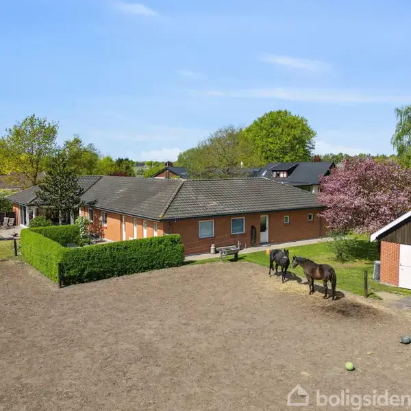 Med en central beliggenhed i fredlige omgivelser og med kort afstand til skole, børnehave og indkøb, finder I en meget velholdt villa. Denne storparcel byder på en grund med plads til mindre dyrehold fx heste. Der er på grunden også en bygning med plads til hestebokse. Derudover findes der dobbelt garage med elporte, på samlet 120m², hvilket også kan indrettes til liberalt erhverv. I bliver budt velkommen i entréen, hvorfra der er adgang til det praktiske bryggers, der også leder til garagerne