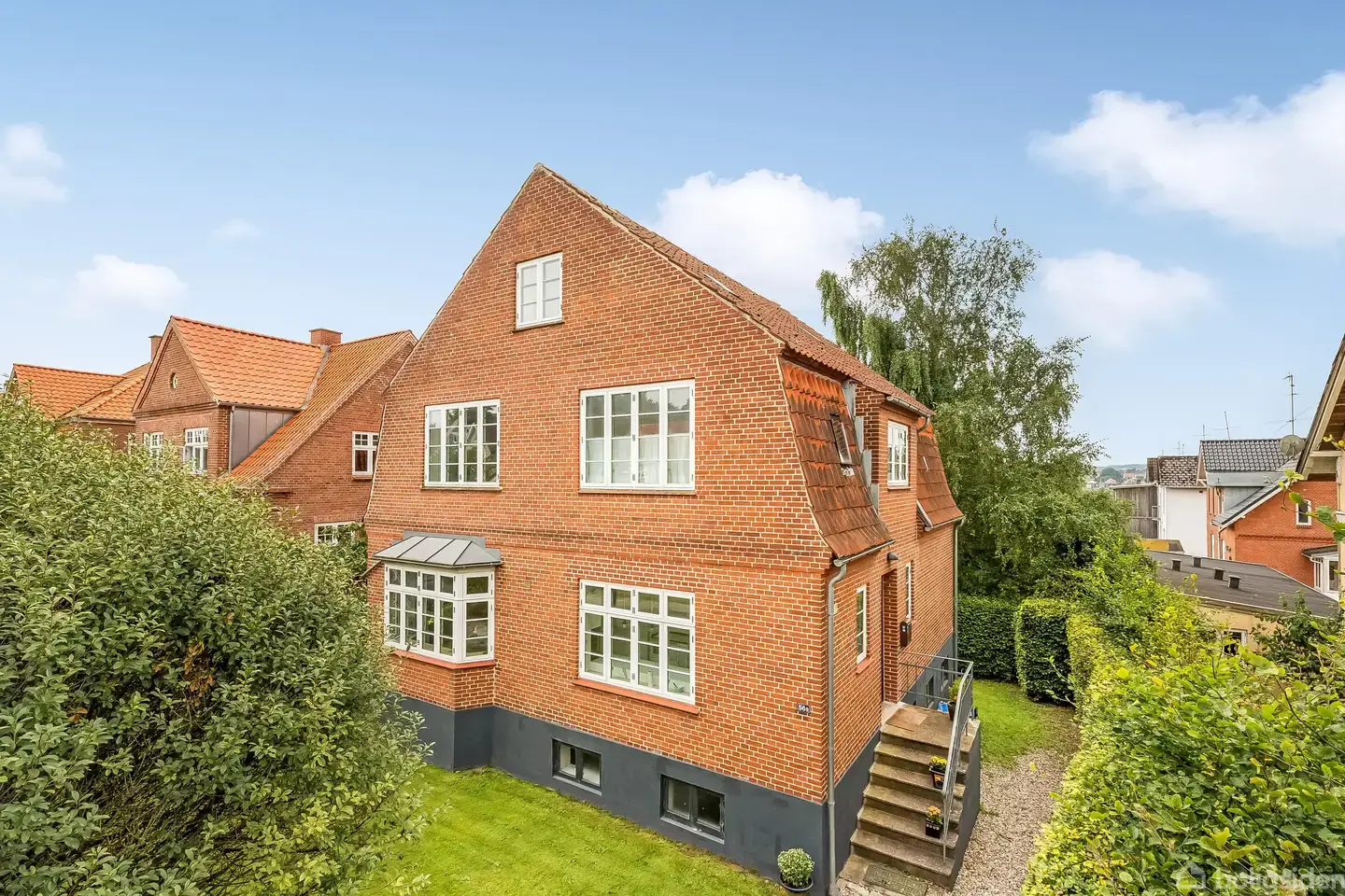 Aastrupvej 56a i 6100 Haderslev byder på en charmerende og rummelig bolig, hvor klassisk elegance møder funktionalitet i flere veludnyttede planer. Allerede ved ankomsten mærker man husets imødekommende atmosfære, der fortsætter, når man træder ind i entréen, der fungerer som et naturligt bindeled mellem stueplanens opholdsrum. Køkkenet er velindrettet og åbner op til de lyse stuer, der indbyder til både hverdagsliv og festlige sammenkomster. De store vinduespartier, særligt i spisestuen med kar