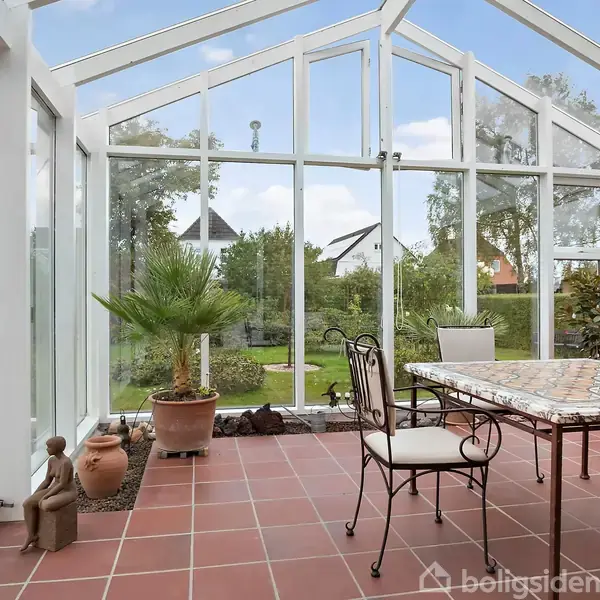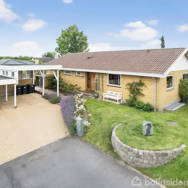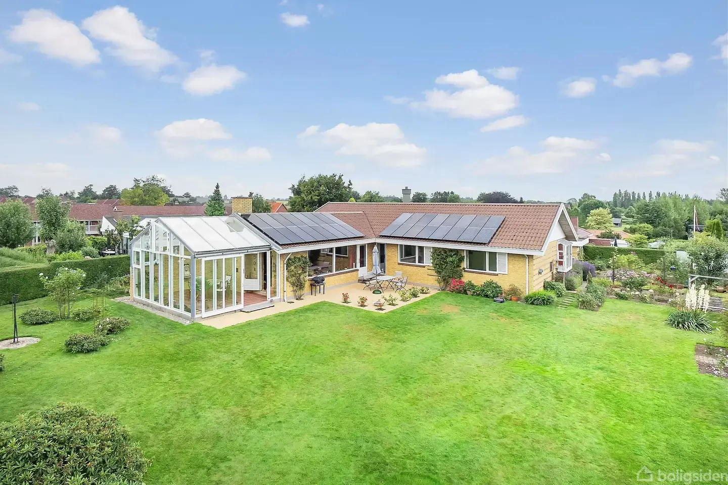 Åbent hus med tilmeldingskrav 2/2 - klik på billede - Da man opførte villaen på Æblehaven 8 i Nørre Aaby, er der ingen tvivl om, at det har været fremtidens hus. Højtloftede rum, fjernvarme og masser af kvadratmeter - måske endda for mange til gennemsnitsfamilien anno 1971. I dag, hvor vi lever i fremtiden, er huset blevet endnu mere relevant, og I kan glæde jer til skønne opdateringer som de effektive solpaneler og den dejlige vinterhave. Nuværende ejer (er civilingeniør) har selv tegnet huset, som dermed kun har haft én ejer. I finder villaen for enden af det lille vænge, og mod vejen gør boligen ikke noget større væsen af sig. Roser og lavendel flankerer indkørslen, som munder ud i en stor carport på 49 m2. Her er rigelig plads til begge familiebiler, og i den ene side er taget endda hævet, så der også er plads til autocamperen, campingvognen eller håndværkerbilen. Omkring huset har man etableret omfangsdræn, hvilket er særligt relevant for villaens gode, tørre underetage. Her får I 67 m2, og de disponible rum kan bruges til mange formål. Værksted, vinrum og vaskerum er allerede på plads, men det er selvfølgelig helt op til jer, hvordan de mange bonuskvadratmeter skal fordeles. Også i stueplan får I god plads, og husets vinkel giver naturlige afdelinger til privatliv og fællesskab. Således ligger de tre værelser samlet i en decideret værelsesafdeling, hvor I desuden finder boligens store badeværelse og lille gæstetoilet. I modsatte side ligger derimod opholdsrummene, som tæller to stuer og et lyst spisekøkken. Køkkenet har fortsat sine originale Tectum-elementer, men det står jer frit for at opdatere. Og hvis I gør, kan I støtte jer til planløsningens fleksibilitet, for da huset stort set er fri for bærende vægge, har I alle muligheder for at gentænke rumfordelingen. Hvis I er havemennesker, har I garanteret allerede opdaget den hemmelige gevinst - nemlig den skønne vinterhave på sydvestsiden af huset. De 24 m2 er nemme at holde frostfri, og den imponerende loftshøjde giver ægte muligheder for at dyrke granatæbler og citrusfrugter på 55° nordlig bredde. Bemærk desuden, at haven med sine 1.371 m2 er ganske omfattende, så I kan sidde omgivet af roser, rododendron og privatliv. Nørre Aaby har det hele, og I kan endda gå til det meste. Tusindårslegeparken ligger bogstaveligt talt skråt overfor, og byen byder på både skoler, handlemuligheder og fritidsaktiviteter.