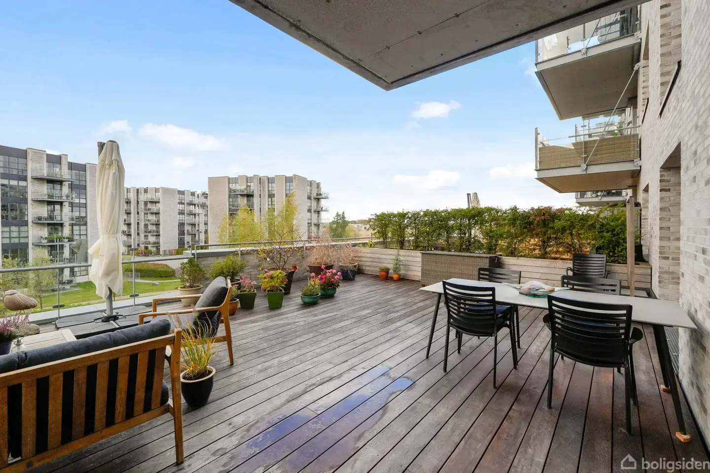 Selv iklædt de mest jordnære og realistiske briller må man sige, at denne lejlighed i Trekroner ligner en rigtig drømmebolig. Standen er mere end overbevisende, og de lyse rum åbner op til en uimodståelig tagterrasse, hvor I fra de rolige rammer kan nyde den særlige energi, som Trekroner har. Få minutter skiller jer fra stationen, og alligevel kan I følge stien uafbrudt op forbi søen og videre langs Himmelev Bæk.Konteksten er værd at tage med, for netop denne del af Trekroner hører til områdets