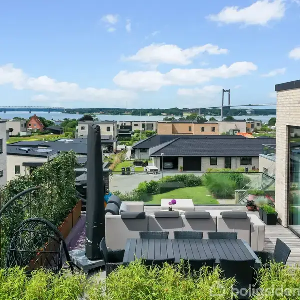 Velkommen til denne imponerende funkisvilla, der er en sand perle i det nye parcelhusområde. Ejendommen, der er opført i 2018, byder på et særdeles moderne design og et nøje gennemført materialevalg. Fordelingen over tre forskudte plan, giver en særdeles god og funktionel planløsning. Når du træder ind i den storslåede hall, bliver du mødt af et virkelig flot trappeforløb, og adgang til et stilfuldt badeværelse og en stor forældreafdeling, der inkluderer et rummeligt soveværelse, walk-in og et badeværelse med både brus og badekar. På øverste plan finder du husets hjerte; det åbne køkken-alrum og stuen adskilt af en elegant indbygget bio-pejs. I køkkenet har du adgang til et viktualierum og til den store tagterrasse, hvorfra udsigten er intet mindre end spektakulær. Både fra terrassen og fra stue og køkken-alrum, kan du nyde synet af områdets tage og den betagende udsigt over vandet og de to broer. Nederste plan rummer tre lyse værelser, et kontor og et praktisk bryggers med direkte udgang til dobbelt carport og skur. De to af de tre værelser er sammenhængende, men kan evt. opdeles ved behov herfor. Materialevalget gennem hele villaen er nøje udvalgt og sikrer høj kvalitet og æstetik overalt. Ejendommens have er velanlagt med plads til leg såvel som afslapning. Beliggenheden kunne ikke være bedre; tæt på skole, byliv, skov og vand og med passende men kort afstand til motorvejsnettet for pendleren.