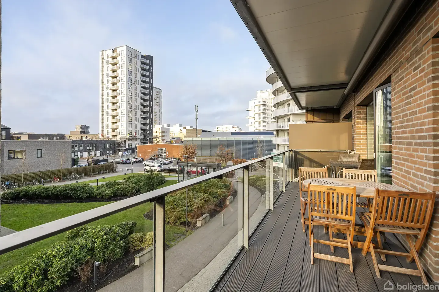 På Amager Strandvej 112M, 1. th., 2300 København S udbydes denne lyse og indbydende lejlighed på 132 kvm, beliggende på 1. sal – med en sjælden kombination af masser af plads, to badeværelser og udeliv på begge sider. Boligen er i dag indrettet som en veldisponeret 4-værelses, men planløsningen giver en oplagt mulighed for at etablere et 5. værelse, hvis der er behov for ekstra kontor, børneværelse eller gæsterum. Man bydes velkommen i en rummelig entré med gode opbevaringsmuligheder, og herfra