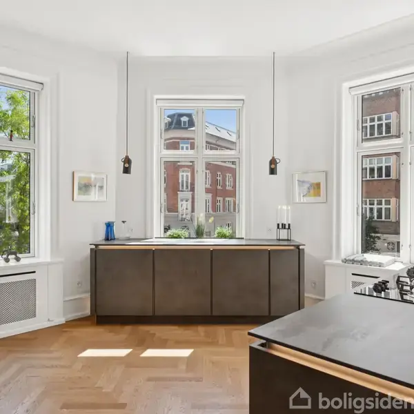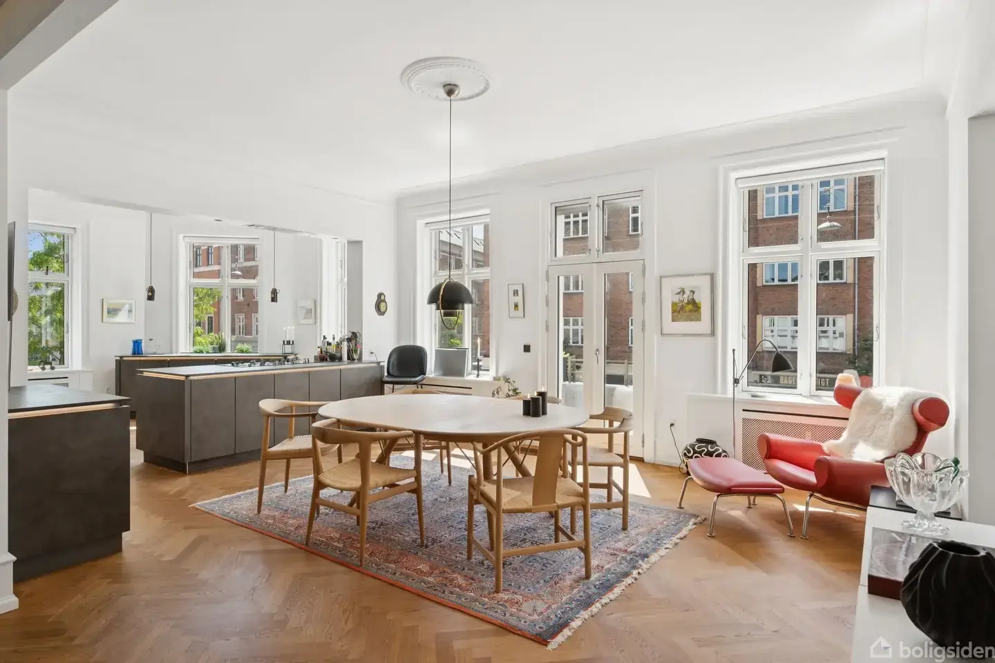 På Amagerbrogade står denne lejlighed nu klar til livsnyderne, som søger et stilfuldt hjem, hvor der er masser af plads. Der er tale om en lækkert istandsat bolig, som byder på hele 226 kvadratmeter. Planløsningen inkluderer blandt andet to soveværelser, to badeværelser og et køkken-alrum, som er i XL-størrelse. Lejligheden har til huse på første sal i et præsentabelt byggeri fra 1882. Bagtil er der anlagt et hyggeligt gårdmiljø, som er til fælles brug for ejendommens beboere. Indenfor kendetegnes boligen af højloftede og lyse rum. Diskret stuk og charmerende radiatorskjulere bidrager til den herskabelige atmosfære, der forstærkes yderligere af de elegante sildebensgulve. I køkken-alrummet er der dobbeltdør ud til en lille altan, og for køkkensektionen er der valgt et råt, mørkt design. Det veludstyrede køkken har to indbyggede ovne og kogeø med stor gaskogeplade. Køkken-alrummet ligger en suite med den ene af lejlighedens to stuer, der begge er regulære og rummelige. Det største af de to soveværelser har walk-through-closet med direkte forbindelse til et udsøgt badeværelse. Dette har dobbelt bruseniche, mens det andet badeværelse har vaskefaciliteter. Afslutningsvis er der en entré og et par pulterrum, og boligen har derudover eget kælderafsnit med et bryggers og et disponibelt rum. Fra lejligheden er der under 200 meter til Amager Centret, og der er tillige kun få minutters gang til Amagerbro Station. Stranden og Amager Fælled nås hurtigt på cykel, og det tager heller ikke mere end cirka 15 minutter at cykle til Kongens Nytorv.