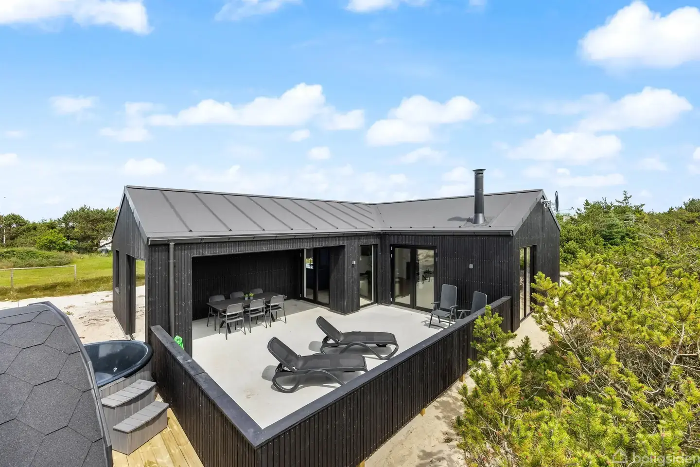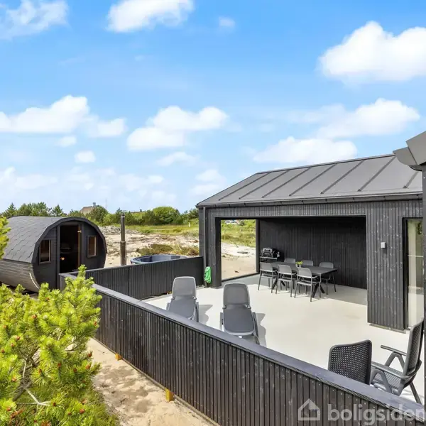 Åbent hus med tilmeldingskrav 2/2 - klik på billede - Drømmer du om et lyst, moderne sommerhus i naturskønne omgivelser tæt på både fjord og hav – og med en attraktiv lejeindtægt som ekstra bonus? Så byder dette skønne feriehus nær Ringkøbing Fjord på en sjælden kombination af stemning, komfort og investeringspotentiale. Huset, der er opført i 2025, fremstår med højt til loftet, lyse materialer og store vinduespartier, der lader dagslyset strømme ind og skaber en let og indbydende atmosfære. Her er plads til nærvær, samvær og afslapning – uanset om huset bruges som privat fristed eller udlejes til feriegæster, der vender tilbage år efter år. Husets hjerte er det åbne opholdsrum, hvor køkken og stue smelter sammen i et naturligt samlingspunkt. Det moderne køkken er fuldt udstyret og gør madlavningen til en fornøjelse, mens spisepladsen og den hyggelige sofagruppe indbyder til lange middage, brætspil og afslappende aftener foran den knitrende brændeovn. Planløsningen er både praktisk og komfortabel med tre gode soveværelser med dobbeltsenge samt tre badeværelser – alle med gulvvarme. Det gør huset ideelt til både familieophold og udlejning, hvor komfort og funktionalitet er i høj kurs. Udendørs venter en skøn, lukket terrasse, hvor solen, grillmiddage og lange sommeraftener kan nydes i fredelige omgivelser. Her er også husets helt store luksus: udesauna og vildmarksbad, som giver gæster og ejere mulighed for at læne sig tilbage, nyde varmen og lade blikket glide op mod stjernehimlen. Beliggenheden er i det hyggelige Nr. Lyngvig. Her er kort afstand til Vesterhavets brede sandstrande, Ringkøbing Fjords rolige vande, den skønne Nr. Lyngvig Havn, og den stemningsfulde havneby Hvide Sande med butikker, restauranter og et levende miljø året rundt. Kombinationen af et nyere, moderne sommerhus, et eftertragtet ferieområde og en dokumenteret god lejeindtægt gør denne ejendom til et oplagt valg – både som personligt fristed og som en solid investering i fritidsmarkedet.