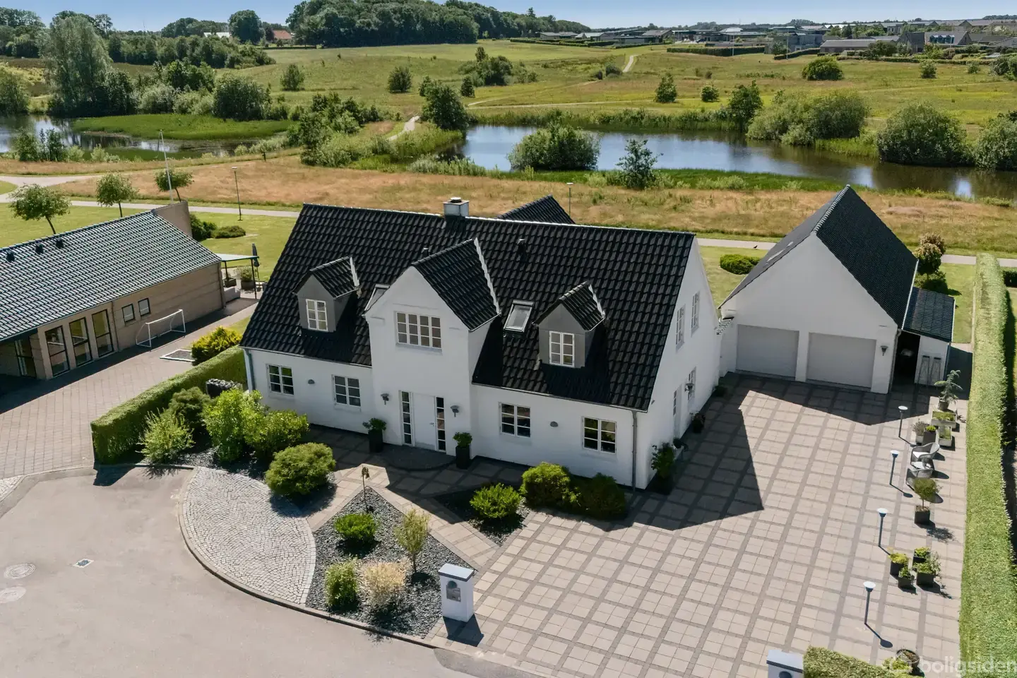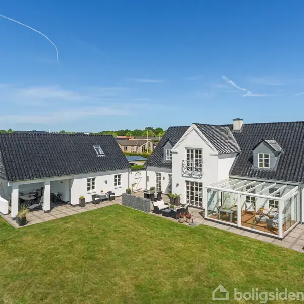 Stor, moderne villa med lyse opholdsrum og udsigt til grønne arealer