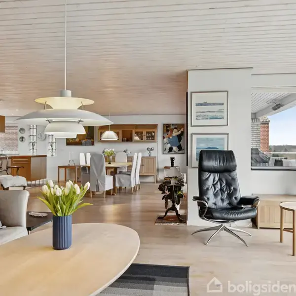 Der er boliger, man træder ind i – og så er der boliger, man mærker med det samme - denne villa på Arnakkegårds Allé 28 hører til sidstnævnte. Her er udsigten ikke bare et flot kig, men en stemning, der følger dig gennem hele huset. Fra stuen, fra altanen og fra underetagen åbner landskabet sig med grønne arealer, skovens dybde og fjorden, der ligger roligt i baggrunden. Et blik, der skifter karakter med årstiderne og giver en sjælden fornemmelse af luft, ro og sammenhæng med naturen. Boligen li