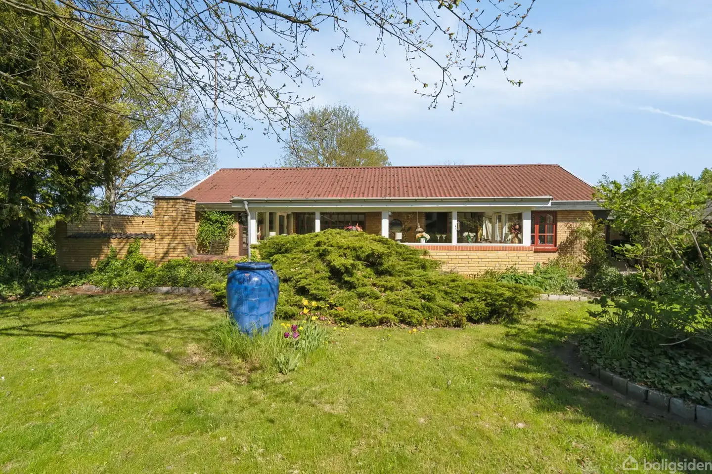 Villa på lukket vej i Heden  For enden af en lukket vej i Heden får I en dejlig udsigt over græssende heste, folde og skovarelaer, som understreger idyllen og den landlige beliggenhed. Det frodige udtryk er trukket med ind i haven, som består af smukke bede, træer, hyggelige kroge og masser af udsigtsposter. Inden døre får I god plads samt mulighed for at sætte jeres eget præg. Velkommen til jeres næste hjem.  De mange velplacerede terrasser sikrer frit slag mellem ophold i solen og skyggen. Fle