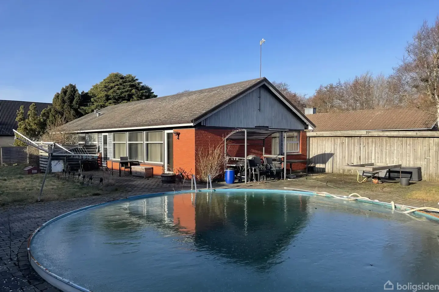 I et attraktivt og eftertragtet område finder du dette enfamiliehus, beliggende på en dejlig stor grund med masser af muligheder. Grunden rummer både pool, drivhus samt et større areal, der tidligere har været anvendt som køkkenhave – ideelt for dig, der drømmer om udeliv, selvforsyning eller plads til leg og afslapning.Boligen har en god og funktionel planløsning med to badeværelser, pænt køkken, hyggelig stue, soveværelse samt tre øvrige værelser. Hertil kommer entré, bryggers/baggang, depotru