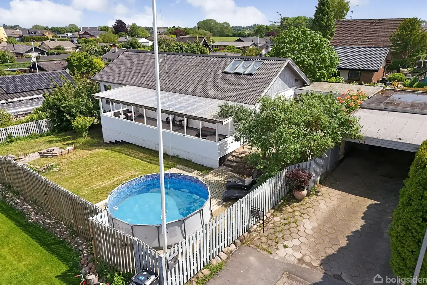 Et skjult paradis med glasfacader og hemmelighederBag stengærdet og det tætte hegn gemmer sig en hemmelighed — en hemmelighed, der næsten pirrer nysgerrigheden, inden man overhovedet træder indenfor. Det er som om, at her venter noget ganske særligt, noget man kun finder i Valløby, når man tør se lidt længere end byens almindelige rammer. Slyngroserne har indtaget indkørslen og snor sig legesygt omkring indgangspartiet, hvor en carport står parat til at tage imod bilen – eller måske en ladcyke