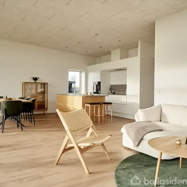 Velkommen til denne nyopførte, indflytningsklare villa i det naturskønne Fjellerad – en moderne og energivenlig bolig i særklasse. Huset er et passivhus, hvilket betyder kompromisløs komfort med minimalt energiforbrug – et hjem der både er godt for miljøet og for pengepungen. Bæredygtigt byggeri med gennemtænkt design: Boligen er opført i tidløse, kvalitetsmaterialer og er skabt med fokus på både æstetik og funktionalitet. De store panoramavinduer giver et enestående lysindfald og åben udsigt til det bakkede landskab. Her er plads til både ro og fordybelse, såvel som til hyggelige stunder med familien. Køkken-alrum og stue i ét – med udsigt og udgang til terrasse: Husets hjerte er det åbne køkken-alrum og stue, hvor de store vinduespartier og den hævede træterrasse inviterer naturen helt indenfor. Køkkenet er moderne og stilrent med grebsfrie fronter og høj funktionalitet. Privat forældreafdeling og god værelsesfordeling: Forældreafdelingen rummer et dejligt soveværelse med walk-in closet og eget badeværelse med brus – en luksuriøs og praktisk løsning. De to børneværelser ligger i husets modsatte ende og har adgang til et separat gæste-/børnebadeværelse. Mellem de 2 værelser er der et praktisk multirum, hvor man evt. kan indrettet en fællesstue til børnene. Bryggers og moderne komfort: Det praktiske bryggers sikrer en nem hverdag med direkte indgang og god opbevaringsplads. Hele huset er naturligvis opført efter de nyeste energikrav og har ventilationsanlæg med varmegenvinding, hvilket bidrager til et sundt og behageligt indeklima året rundt. Attraktiv beliggenhed tæt på Gistrup og supersygehuset: Fjellerad er en lille og fredelig by med kort afstand til Gistrup og det nye Aalborg Universitetshospital. Området er populært blandt både børnefamilier og pendlerfamilier, som ønsker at bo tæt på naturen – uden at gå på kompromis med hverdagsbekvemmeligheder. For fremvisning kontakt ejendomsmægler Bo Lynge på mobil: 21200808