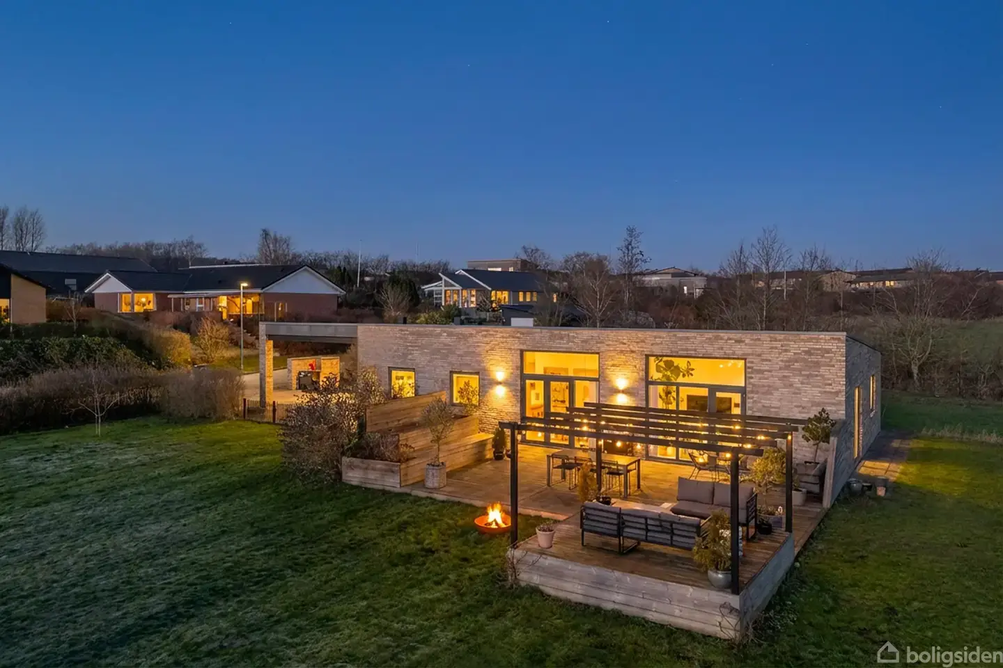 home har fornøjelsen af at udbyde denne moderne og indbydende villa beliggende i det attraktive Skødstrup. Her får man en bolig, hvor æstetik, funktionalitet og komfort smelter sammen i en harmonisk helhed både inde og ude. Den arkitektonisk flotte ejendom fremstår med et stilrent udtryk i lyse mursten og store vinduespartier, som giver et fantastisk lysindfald og en glidende overgang mellem boligens indre og de skønne udearealer. Den sydvestvendte træterrasse er en oplevelse i sig selv hvor man