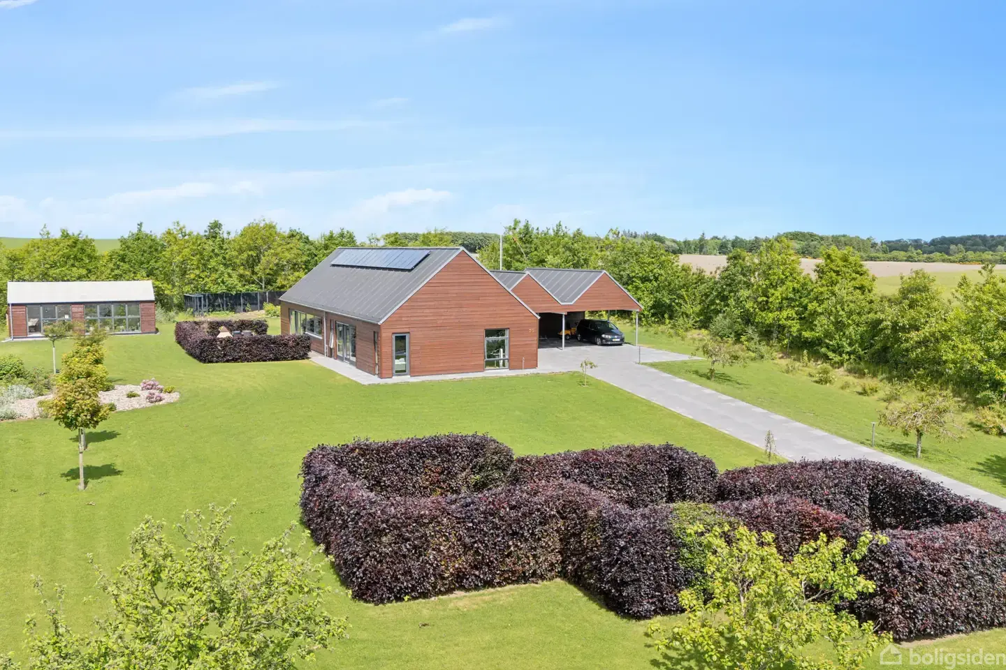 Det var arkitekterne fra Arkikon, en lokal tegnestue på Grenaaegnen, der i 2011 stod bag de elegante linjer, som kendetegner denne ejendom. Resultatet er et lavenergihus, hvis bæredygtighed og skarpe design går op i en højere enhed, og både ude og inde er der lagt vægt på gode, gedigne materialer, som tilsvarende er med til at højne stedets æstetiske kvaliteter. Beliggenheden i den lille landsby Ålsrode, der ligger en smule syd for Grenaa, formår at kombinere flot natur med korte afstande til hv