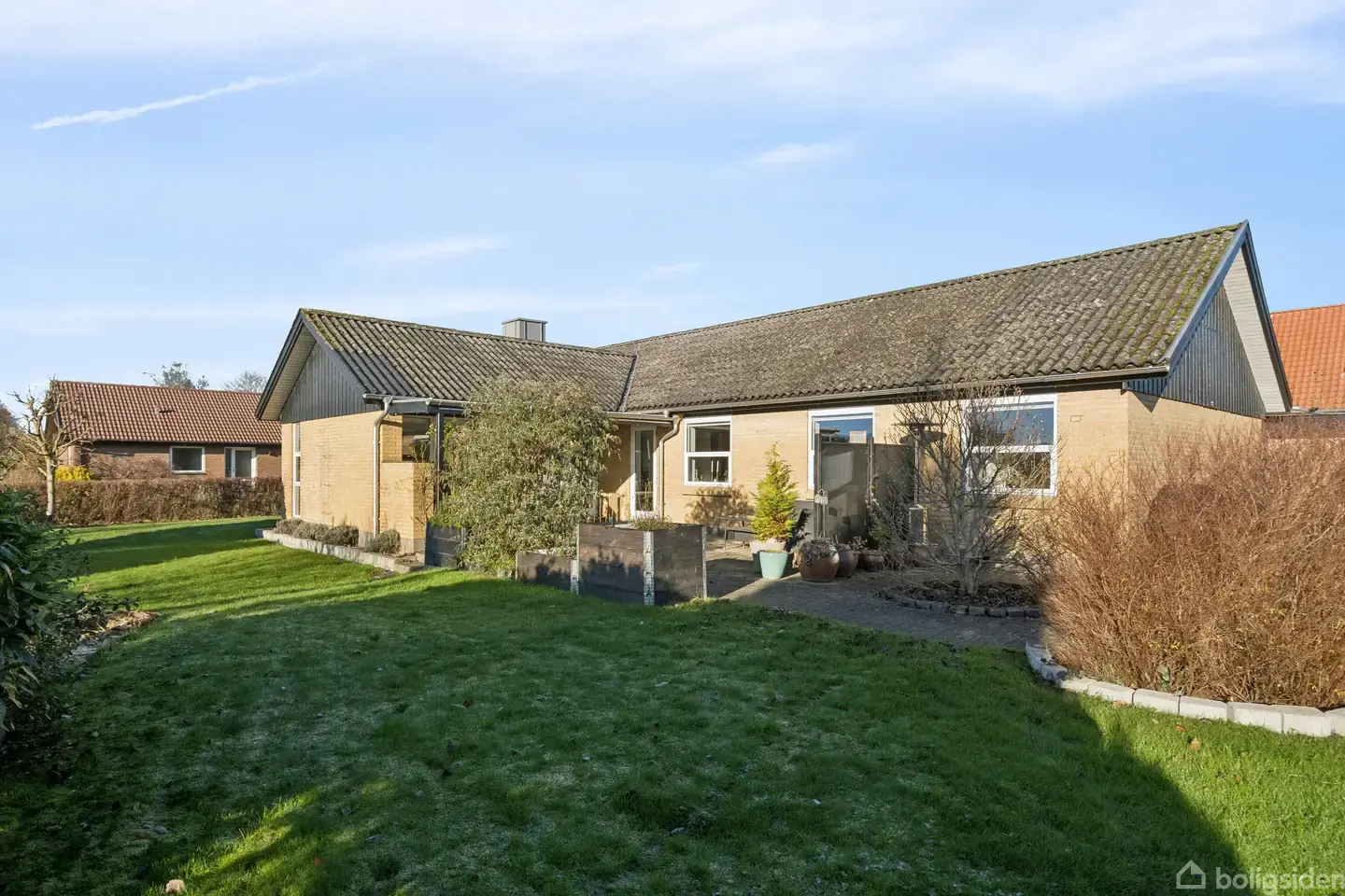 Hyggelig 1-plansvilla i eftertragtet kvarter Denne vinkelvilla i Egtved er et godt match for jer, der søger en bolig, som kan tilpasses familielivets forskellige behov gennem årenes løb. Huset byder på 154 kvadratmeter i ét plan, og indretningen inkluderer blandt andet et lækkert, stort spisekøkken og et stort stuemiljø. Der er hertil tre værelser – og potentiale for at lave et fjerde.Ejendommen er opført i 1973, og den fremstår i klassiske gule sten med sortmalede gavle og sadeltag. Mod haven p