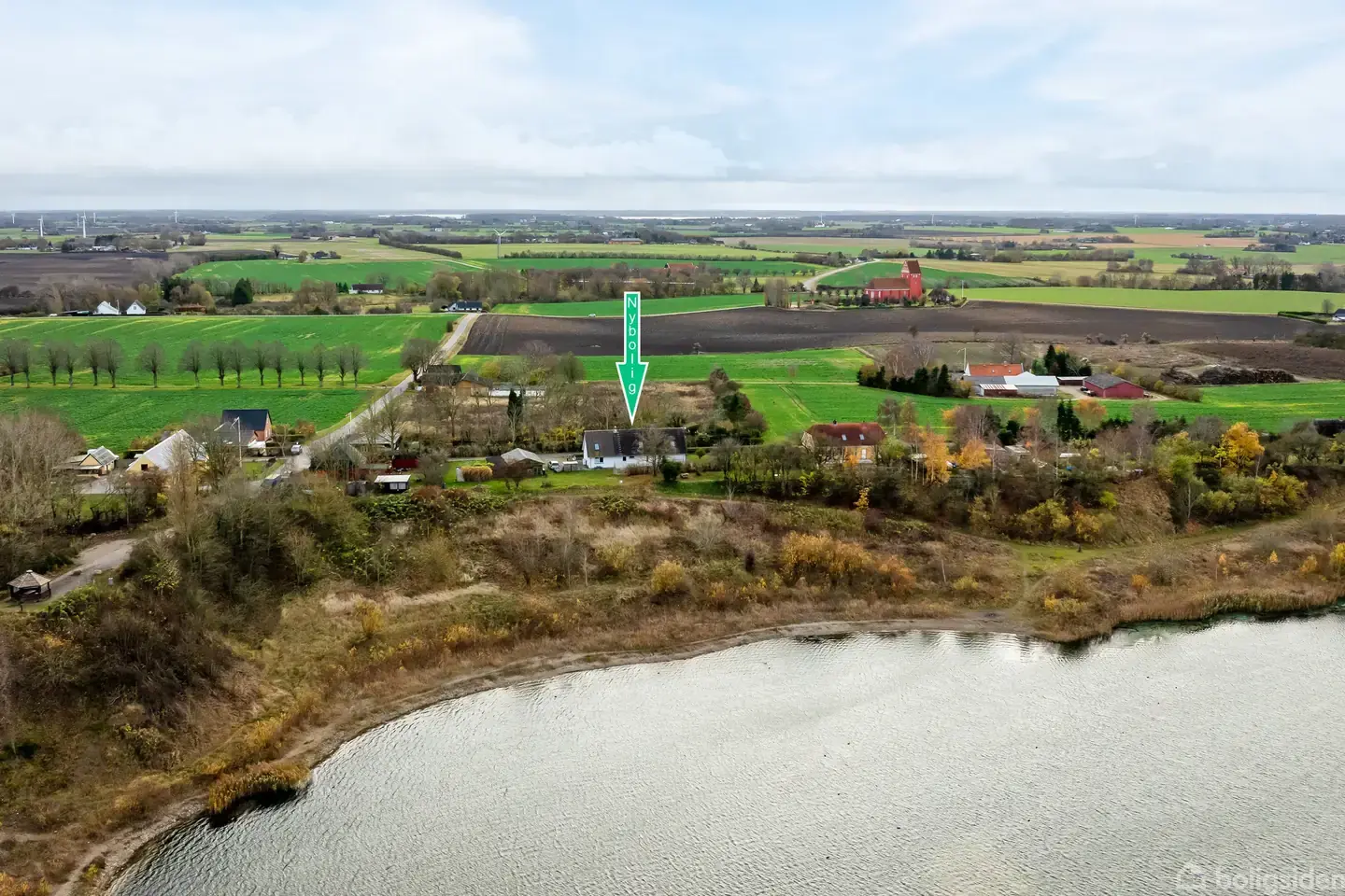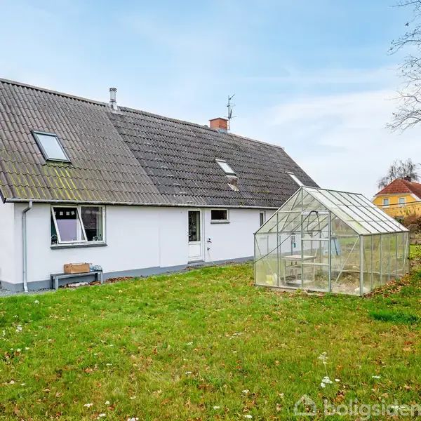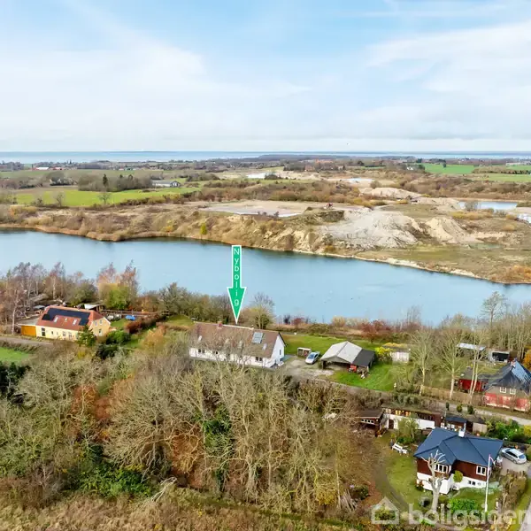 Stor rummelig landejendom i 2 plan beliggende ca. 3 km. vest for Nr. Alslev by med Baunehøj Fritidsområde som nærmeste nabo.Bygningen med god tilbygning fra 2011 har et enkelt og funktionelt ydre med et klassisk saddeltag og hvide facader, der understøtter den ro og fred, der præger omgivelserne.Den rummelige have og placeringen giver luft omkring huset, hvilket skaber et privat og fredeligt hjem tæt på naturen. Stueetagen rummer en gennemgående entré, der forbinder et køkken med god skabsplads
