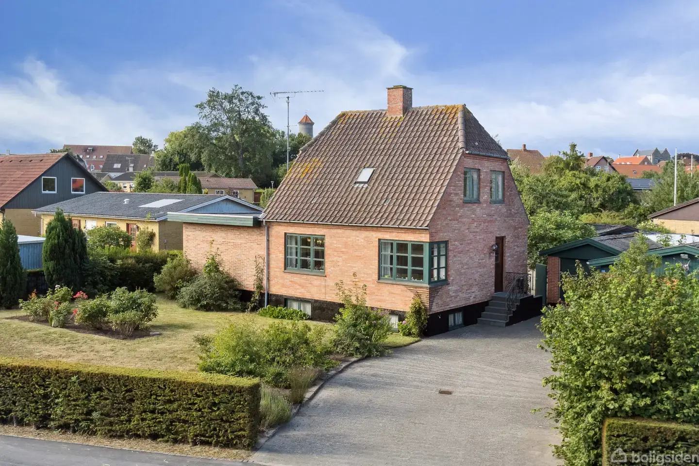 Med denne klassiske murermestervilla i Aakirkeby følger en masse spændende muligheder. Her får I nemlig 241 etagemeter fordelt på 142 m2 bolig i halvandet plan og en 99 m2 stor kælder, hvoraf en del tidligere har været anvendt til erhverv. Herudover er der en flot muret garagebygning på 59 m2 og en rigtig god have på den 995 m2 store grund. Hvis planen er at drive erhverv hjemmefra, er beliggenheden med nem og hurtig forbindelse mod både Rønne og Nexø via hovedvejen endnu et stort plus. Villaen