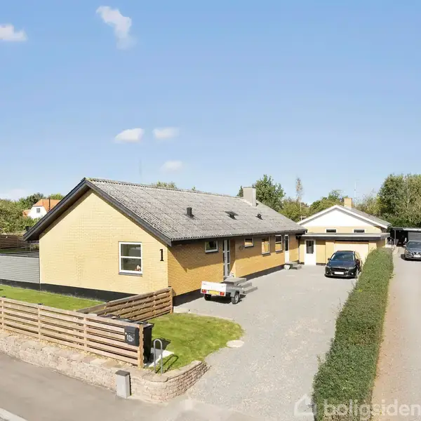 Lige udenfor Åkirkeby, på Bjælkestensvejen 1 ligger dette flot moderniserede 1-planshus. Ejendommen fremstår i dag lys, rummelig og moderne, og de 156 m² er indrettet med fokus på både funktionalitet og komfort med gulvvarme i de fleste af husets opholdsrum. Ejendommen ligger i et attraktivt område syd for Aakirkeby, hvor man får både ro, natur og kort afstand til byens faciliteter. Fra huset er der en dejlig udsigt over åbne marker, og kun få skridt derfra ligger Byskoven med sine skønne stier, legeplads, shelter- og bålpladser tiltrækker mange brugere. Villaen byder på hele fire soveværelser, hvilket gør det oplagt til den store familie eller til jer, der ønsker ekstra plads til hjemmekontor eller gæsteværelse. Hertil kommer to gode badeværelser, hvor det ene fremstår helt nyrenoveret. Grunden er på 1.165 m² og er nemt anlagt stor skærvebelagt indkørsel til god og isoleret garage. Haven der er helt indhegnet, er flot har en stor græsplæne med god plads til trampolin, legehus, gyngestativ m.m. Den tilhørende garage er blevet isoleret, hvilket åbner for flere anvendelsesmuligheder, fx hobbyrum eller opbevaring. 1-planshuset indeholder: - Bryggers/hverdagsentre - Køkkenalrum med stor køkkenø - i åben forbindelse til stue - Stor stue med nyere brændeovn og udgang til stor terrasse - Entre - To store værelser - To børneværelser - Nyrenoveret badeværelse med stor bruseplads, væghængt toilet og gulvvarme. - Flisebadeværelse med toilet Derudover: - Isoleret garage 1-planshus med 4 værelser og rolig beliggenhed - udenfor Åkirkeby!