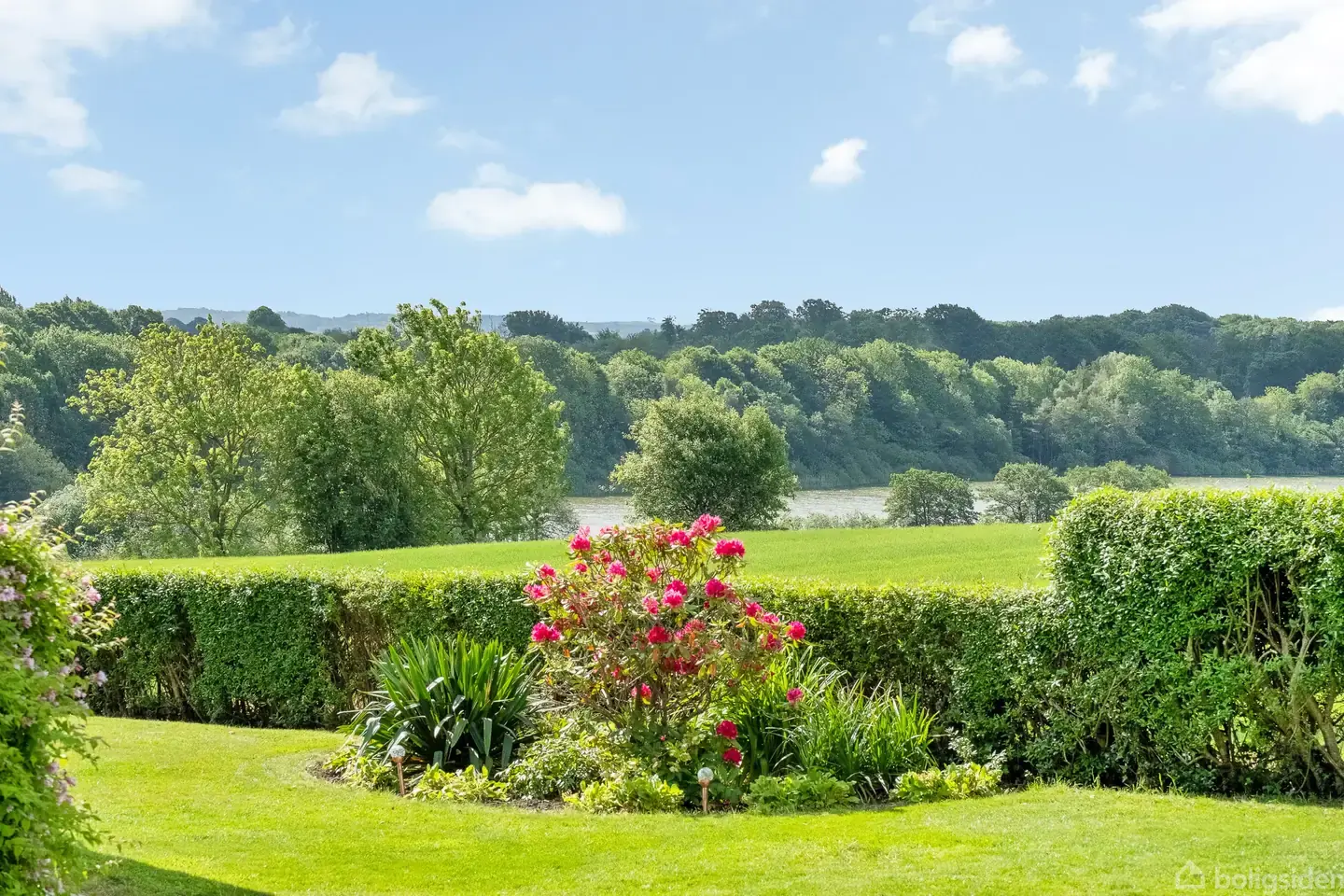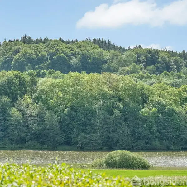Smuk panoramaudsigt til marker, sø og skoven i baggrunden