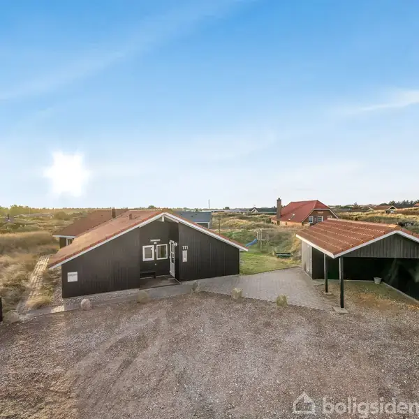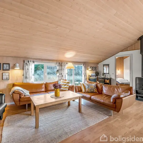 Velholdt sommerhus beliggende i rolige omgivelser ca. 700. m fra havet og med udsigt over de smukke klit- og lyngområder i Bjerregaard. Rundt om huset er der nogle skønne terrasser, hvor man sidder helt privat og ugenert, og hvor det altid er muligt at finde en plet med både sol og læ. Til huset hører en carport samt et fritliggende udhus med god plads til cykler og grill. Der er indgang til huset gennem en fin entré med plads til sko og frakker samt diverse opbevaring. Der er hele 5 soveværelser i huset. Heraf 3 værelser med dobbeltseng, et værelse med to enkeltsenge samt et værelse med køjesenge. Stort og flot klinkebelagt badeværelse med bruseniche, vask i skabsarrangement spabad, sauna, vaskemaskine og tørretumbler. Herudover er der også et velindrettet gæstebadeværelse med bruseniche og vask i skabsarrangement. Velindrettet køkkenafdeling med god bord- og skabsplads. Køkkenet ligger i forbindelse med spisepladsen og den hyggelige velindrettet opholdsstue, hvor de store vinduespartier samt loft til kip, giver et dejligt lysindfald. Fra stuen er der udgang til den store træterrasse med en masser sol og udsigt over det tilstødende klitlandskab. I stuen er der brændeovn ligesom her er der installeret en varmepumpe. Huset er tilmeldt udlejning hos Novasol og var i 2025 udlejet for kr. 129.000 og er foreløbigt lejet ud for kr. 94.000 i 2026. Kontakt os for en fremvisning!