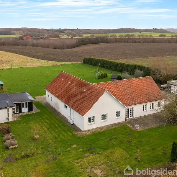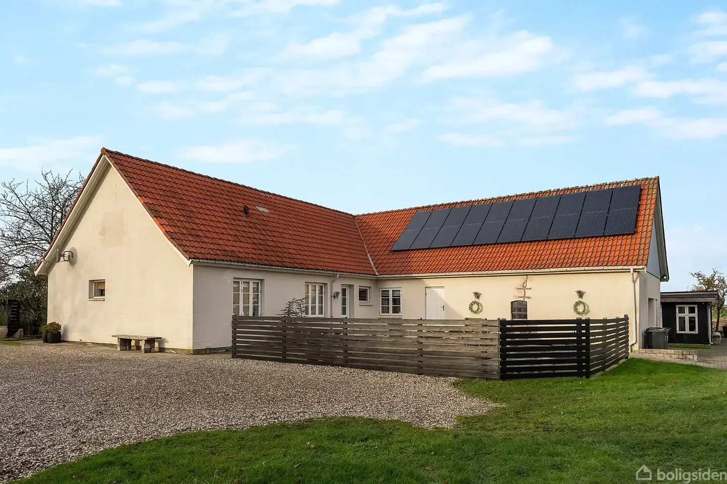 Ejendommen ligger i landlige omgivelser 500 meter nord for Bjerring, omgivet af åbne marker og grønne læhegn. Ved ankomst mødes man af en bred indkørsel med elektrisk port, rødt tegltag og pudsede facader, der giver et enkelt og harmonisk udtryk.Indenfor er planløsningen veldisponeret med fem soverum, to badeværelser og gode opholdsrum. Entréen fordeler naturligt til både værelser og opholdsafdeling. Køkken-alrummet fungerer som samlingspunkt med plads til madlavning og spiseplads samt gode arbe