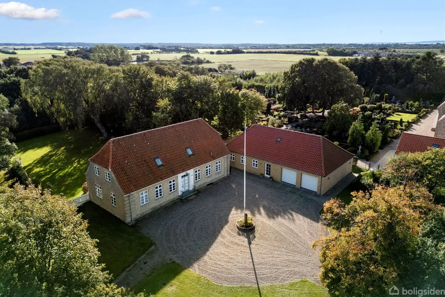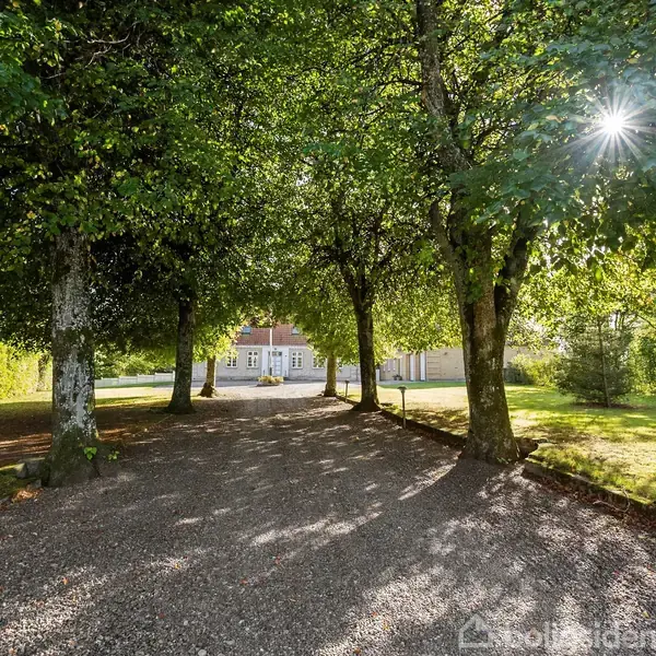 Velkommen til Bjørnsholmvej 160 – en imponerende liebhaverejendom med historie, sjæl og potentiale. Den tidligere præstegård fra 1916 fremstår smukt opført i sandfarvede mursten med rødt tegltag, halvvalmet tagkonstruktion og klassiske gesimser. Allerede ved ankomsten mødes du af to markante søjler og en smuk allé, der leder frem til en stor, grusbelagt gårdsplads med flagstang – en præsentabel og indbydende ankomst til dit nye hjem. Stueplan rummer 150 m² med en veldisponeret planløsning: en elegant entré fører videre til et lyst køkken-alrum, spisestue, rummelig opholdsstue, kontor, to værelser, badeværelse samt bryggers med direkte adgang til overdækket terrasse. Køkkenet er holdt i klassiske hvide nuancer og komplementeres af et stilfuldt skakternet gulv, der går igen i spisestuen. De store vinduespartier inviterer haven helt ind og giver udsigt til den frodige, parklignende have med egen lille skov i bunden af grunden. Førstesalen byder på fire regulære værelser – alle med indbyggede skabe – samt badeværelse og gæstetoilet, hvilket gør etagen ideel for familier med behov for plads og funktionalitet. Kælderen på 25 m² giver ekstra opbevaringsmuligheder. Ejendommen har en tilhørende tilbygning på 175 m², hvoraf 112 m² er registreret til erhverv. Denne del har tidligere fungeret som konfirmandstue, men åbner op for mange anvendelsesmuligheder: atelier, kontor, liberalt erhverv eller måske noget helt tredje. Den 5.970 m² store grund er smukt indrammet af høje træer og skaber en privat, naturskøn ramme om ejendommen. Haven kan indrettes i flere zoner til ophold, leg eller rekreative formål – eller bevares enkel og let at vedligeholde. Her får du en bolig med historie, atmosfære og masser af plads – både ude og inde. Kombinationen af klassisk arkitektur, fleksibel indretning og naturskøn beliggenhed gør denne ejendom ideel til familieliv, erhverv eller en livsstil med plads til fritidsinteresser.