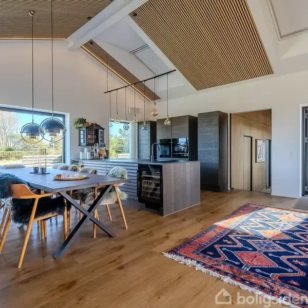 Luksuriøst helårsisoleret fritidshus på 155 m2 placeret på en 1.215 m2 stor grund i anden række til vandet. Beliggenheden giver et skønt havkig og en direkte forbindelse til den fantastiske natur, samtidig med at du kan gå til Juelsmindes hyggelige bymidte og stemningsfulde havn.Husets arkitektur er moderne og gennemført med mørke mursten, trædetaljer og store glaspartier, der bringer masser af lys ind i boligen og skaber en flydende overgang mellem ude og inde. De mange terrasser omkring huset