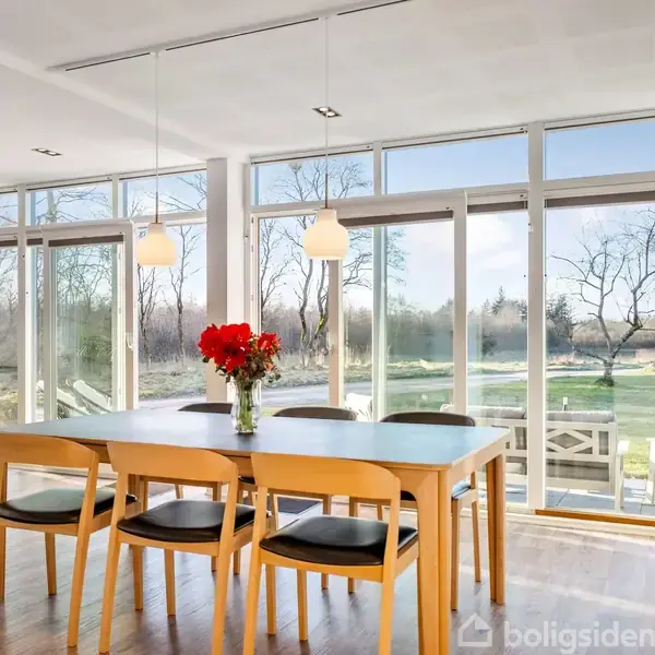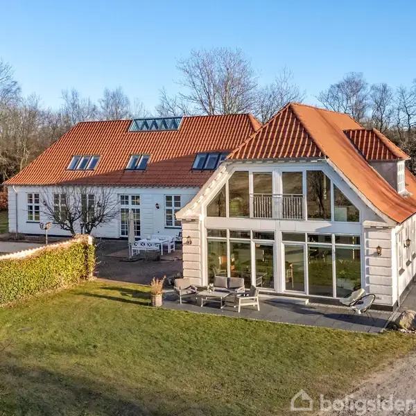 Nogle ejendomme er skabt til et større formål. Filskov gamle skole er netop sådan et sted, hvor historiens vingesus møder nutidens behov. Ejendommen rummer i alt 515 m² under samme tag samt et gæstehus på 21 m² bolig og 21 m² disponibelt rum. I dag er rammerne udnyttet optimalt til en kombination af familieliv, kreativt erhverv og selvstændig udlejning. De store vinduespartier og den markante loftshøjde er bevaret og giver en sjælden rumfornemmelse, hvor lys, ro og plads går hånd i hånd. Den tidligere lærerbolig udgør boligdelen og rummer 182 m² fordelt på to plan med tre værelser, badeværelse, køkken/alrum og stue. Køkken/alrummet er hjemmets naturlige samlingspunkt med et smukt lysindfald og udsigt mod det åbne landskab mod vest, hvor både dyreliv og årstidernes skiften bliver en del af hverdagen. Det store vinduesparti indrammer solnedgangen og gør den til et dagligt øjeblik af ro og nærvær. Hertil kommer en lille, men yderst anvendelig kælder, ideel som viktualierum. Fra boligen er der direkte adgang til skolens øvrige arealer via den velbevarede skolegang med klassisk klinkegulv. Her mærker man virkelig bygningens oprindelse – rummene er generøse, loftshøjden markant, og atmosfæren noget man sjældent finder i almindelige boliger. Den nordlige bygning rummer den oprindelige skole og indeholder i dag en selvstændig lejlighed, øvelokale samt lydstudie og hobbyrum på 1. sal, som let kan indrettes til kontor, atelier eller teenageafdeling. Ejendommen har været anvendt til både bolig og erhverv, og indretningen afspejler tydeligt, at her er plads til fordybelse og pladskrævende aktiviteter uden at gå på kompromis med privatlivet. Der er desuden forberedt installationer på 1. salen til eventuel yderligere udnyttelse. Den separate lejlighed i stueplan har egen indgang, køkken og bad samt plads til op til seks overnattende gæster. Udlejningen fungerer helt uafhængigt af privatboligen og bidrager positivt til økonomien uden at forstyrre hverdagen. Grunden er en oplevelse i sig selv med en gammel, veletableret have, store træer, frugttræer og bærbuske. Den vestvendte terrasse er oplagt på sommerdage, mens gårdhaven er mere intim og læfyldt. Her er bålplads, små stier i den private “skov” og et mere vildt, ugeneret område mod syd. Det store lindetræ, plantet ved skolens indvielse, understreger stedets historie. Trods den landlige beliggenhed er hverdagen nem med lukket sti til skole, institution og købmand. Driftsøkonomien er overraskende fornuftig med jordvarme og energimærke A2010, hvilket giver varmeudgifter på niveau med – eller lavere end – en almindelig villa. Ejendommen er løbende opdateret med respekt for husets alder og fremstår som en sjælden mulighed for jer, der ønsker plads, fleksibilitet, kreativ udfoldelse og et stærkt økonomisk fundament.