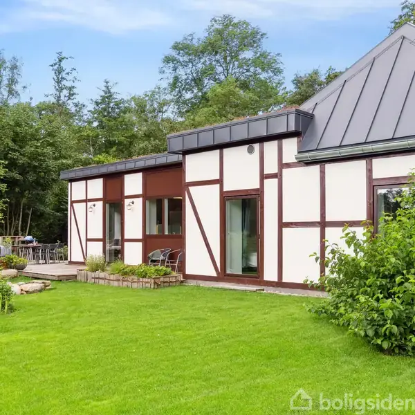 Med en unik placering direkte op til skov og Lindved Å fremstår denne særlige ejendom med et klassisk, raffineret og særdeles stilrent udtryk. Det historiske bindingsværkshus fra 1827 er gennemgribende og nænsomt renoveret samt tilbygget i 2022, hvor respekten for ejendommens oprindelige karakter smelter elegant sammen med en eksklusiv, moderne æstetik – en harmonisk helhed, der opleves både ude og inde.Bæredygtighed har været et bærende element i transformationen, hvilket ligeledes afspejles i