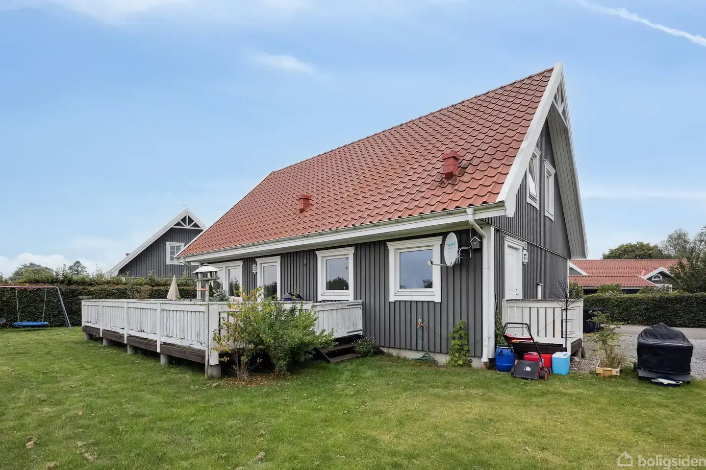 Velkommen til Blødebjergvej 18 - et klassisk træhus fra 2008 med lyse rum, trædæk og en frodig have på 586 m2. Det første, der møder dig her, er en rolig og familievenlig stemning. Huset føles indbydende med brede vinduespartier og en terrasse, der trækker ude og inde sammen — her er plads til morgenkaffen i solen og leg på plænen lige bagved. Indretningen er praktisk og overskuelig med 181 m2 fordelt over to etager. I stueplan ligger et åbent køkken-alrum med en køkken ø og god bordplads, som n