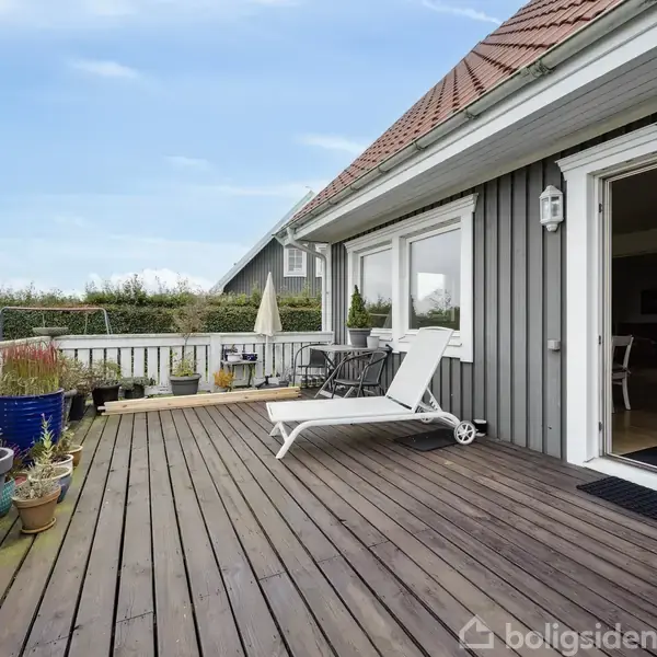 Roligt, familievenligt træhus med lys stemning, terrasse og have