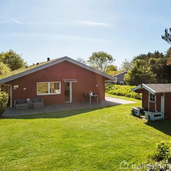 Åbent hus med tilmeldingskrav 7/2 - klik på billede - Træd ind i dette unikke træsommerhus, hvor rødmalet træværk, hvide detaljer og et charmerende græstag skaber en autentisk, nordisk charme. Beliggende i det naturskønne Pirup, Hune, er denne bolig et sandt fristed for den store familie med masser af plads til både børn og gæster. Når du åbner døren til hovedhuset, bliver du mødt af en lys og indbydende entré, som fører dig direkte ind i det store opholdsrum. Her smelter køkken, spisestue og stue sammen i et åbent og rummeligt miljø, perfekt til familieliv og hygge. De mange vinduer lader sollyset strømme ind, og den centrale brændeovn spreder varme og skaber en hyggelig atmosfære på kølige aftener. Opholdsrummet giver adgang til et nydeligt badeværelse og to komfortable værelser. Annekset fungerer nærmest som sit eget sommerhus med stue, to værelser og badeværelse. Den store stue er udstyret med en brændeovn, der gør det til et perfekt opholdsrum for gæster eller som teenageafdeling. To dejlige soveværelser og et fint badeværelse sikrer, at alle kan nyde deres privatliv i rare omgivelser. Mellem hovedhuset og annekset finder du et stort skurrum, der tilbyder rigelig opbevaringsplads til alt fra cykler og strandudstyr til haveredskaber og havemøbler. Endnu et charmerende skur i haven matcher husets æstetik og giver ekstra opbevaringsmuligheder, så I har plads til alt det nødvendige. Omkranset af en dejlig træterrasse, inviterer sommerhuset til udendørs liv året rundt. Her kan du nyde solens stråler fra morgen til aften, mens du slapper af med en god bog eller nyder en grillmiddag med familien. Den velplejede have med sin store græsplæne er perfekt til børneleg og boldspil, hvor små som store kan løbe rundt frit og sikkert. Sommerhusets beliggenhed i Pirup, Hune, tilbyder en perfekt kombination af fred og nærhed til oplevelser. Selvom huset ligger i rolige omgivelser, er der nem adgang til både Hune, Blokhus, Vesterhavet, skoven og Fårup Sommerland. Her er der altid noget at lave for hele familien, uanset om I er til naturoplevelser, strandture eller sjove forlystelser.