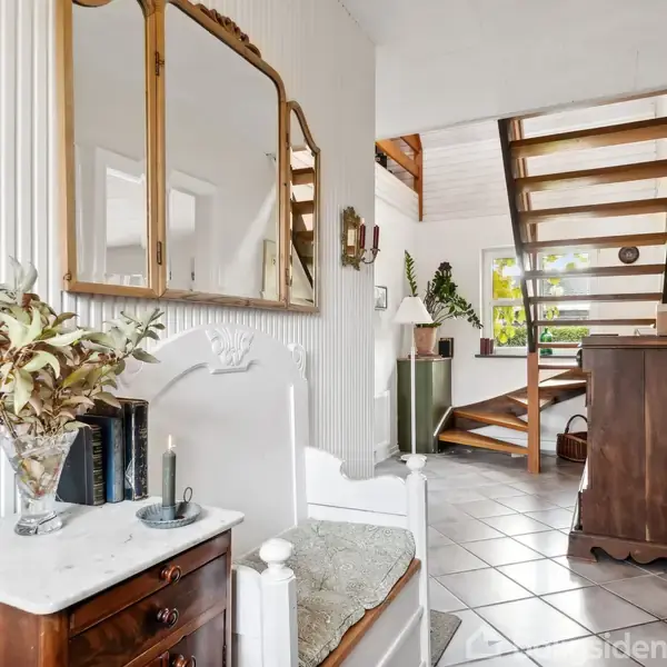 Charmerende gult murstenshus, med fine originale detaljer Dette helårshus er et charmerende gult murstenshus, der udstråler en klassisk, hyggelig atmosfære. Ved ankomst mødes man af en flisebelagt indkørsel, som fører til en praktisk carport, der også har adgang til et redskabsskur, perfekt til opbevaring af haveredskaber og lignende. Husets hovedindgang byder på en entré med klinkegulv og en smuk halvsvings-trappe, der fører op til 1. salen. Der er også en ekstra indgang gennem bryggerse
