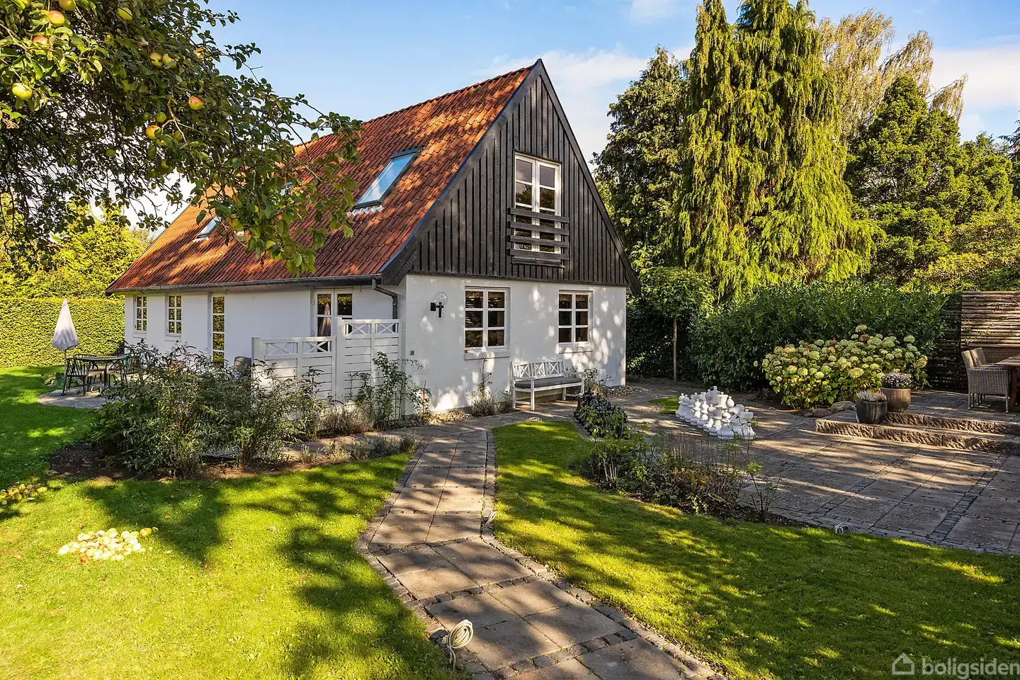 Allerede ved ankomsten til denne villa mærker du straks områdets ro og atmosfære. Boligen er centralt placeret i Humlebæk, for enden af en lukket vej, og præsenterer sig elegant og velholdt med klassiske murede facader og et rødt tegltag. Omgivet af en skøn, arkitekttegnet have byder ejendommen på trygge, private rammer – ideelle til både familieliv og afslapning helt uden forstyrrelser. Haven indrammer boligen med sine smukke grønne omgivelser, hvor der er både plads til leg, fordybelse og hy