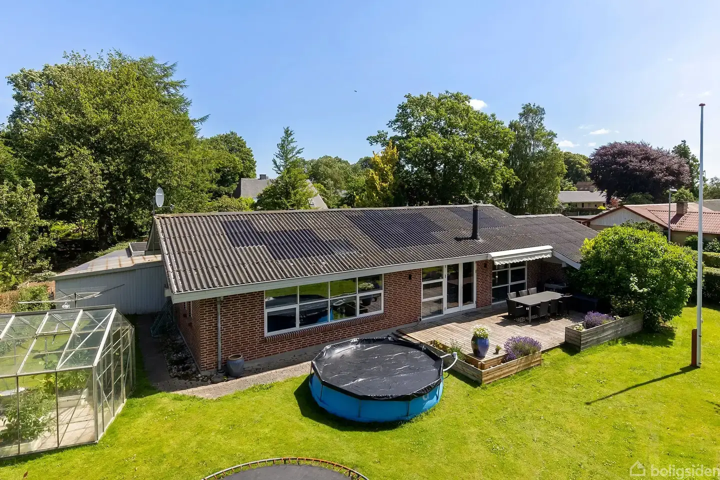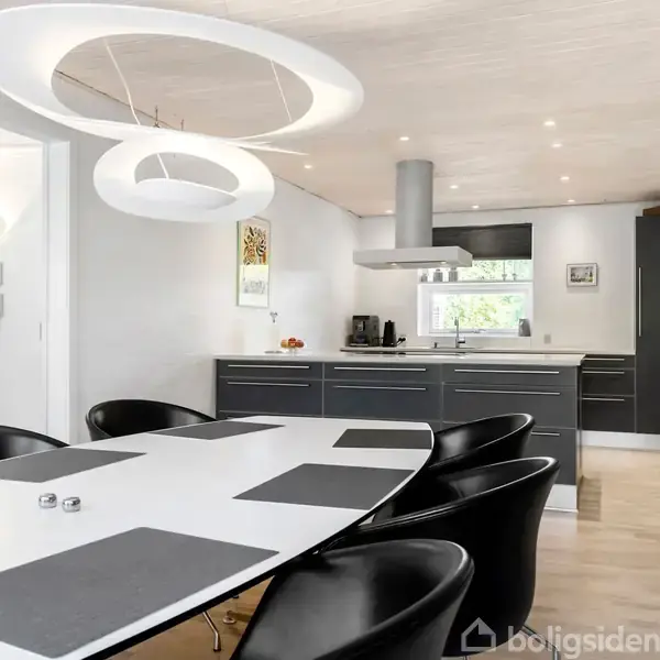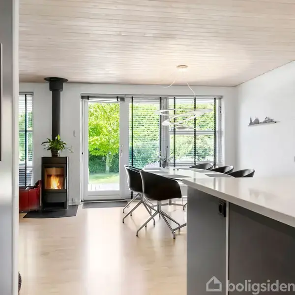 På en fredelig, lukket villavej i et hyggeligt lokalsamfund finder I denne flotte arkitekttegnede villa fra 1978, udvidet i 1981 med en elegant tilbygning. Her er i alt 162 m² bolig med en gennemtænkt planløsning og plads til hele familien. Boligen byder på et stort og lyst køkken-alrum med mørke elementer og en elegant køkken-ø, der skaber et eksklusivt og moderne udtryk. Rummet har masser af naturligt lys og plads til både hverdagsliv og gæster – og den centralt placerede brændeovn tilfører både varme og stemning. Allrummet er stort og flexibelt og er nem at indrette med ekstra spiseplads, hjemmearbejdsplads eller et hyggeligt legehjørne. Fra stuen er der direkte adgang til en helt særlig træterrasse – et uderum, der med det samme indbyder til at blive brugt. Med markisen trukket ud bliver terrassen en lun oase, hvor I kan nyde alt fra morgenkaffen i solens første stråler til lange sommeraftener med god mad og gæster omkring bordet. Haven omkring er grøn, indbydende og fuld af stemning med græsplæne, drivhus og høje træer, der giver både privatliv og karakter. Her mærker man virkelig roen. Villaens værelsesafdeling byder på to store, lyse værelser har begge en rigtig god størrelse. Det tilhørende badeværelse er opført i samme lækre, tidløse materialer som forældreafdelingens, og indrettet med god komfort og æstetik. Villaen rummer desuden et funktionelt bryggers med klinker, et soveværelse med adgang til eget badeværelse, og en entré, der eventuelt kan benyttes som walk-in. Ejendommen er fuldmuret og velholdt med omfugning i 2022/2023 og nymalet udvendigt træværk i 2023. Udenfor er der en god indkørsel med plads til flere biler samt et praktisk udhus til cykler, havemøbler, grill mv. Beliggenheden er ideel for børnefamilien, der ønsker trygge rammer i rolige omgivelser – med kort afstand til både skole, indkøb og byens liv, men uden støj og trafik. Et indflytningsklart hjem med masser af atmosfære og plads til både hverdag og fremtid. Ejendommen er et flot energimærke A2010.