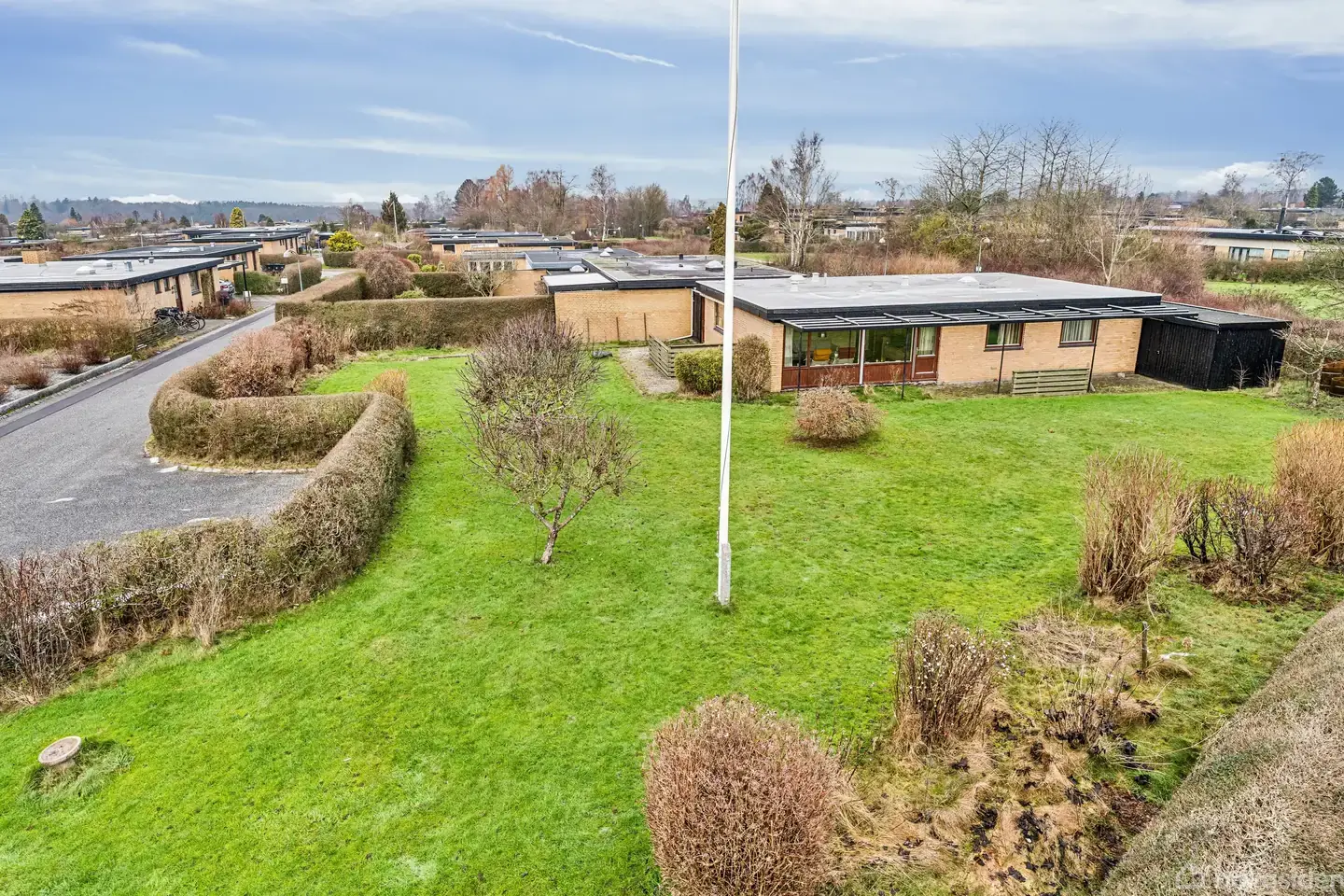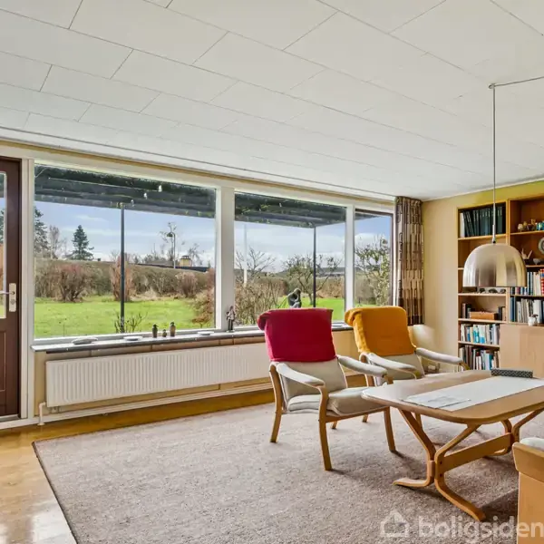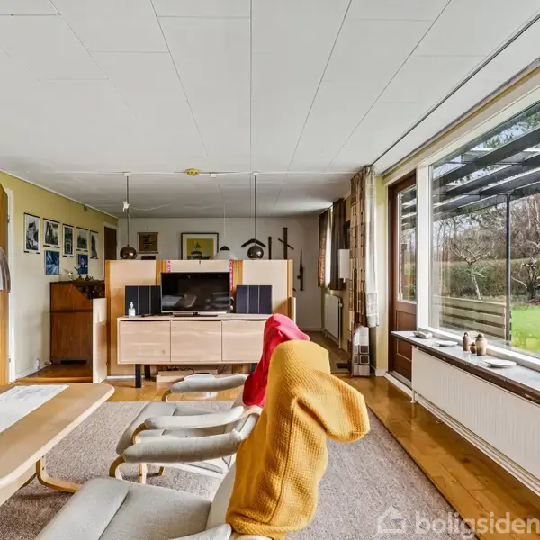 Rækkehus i 122 m² med stor have i roligt område nær skole, natur og offentlig Rækkehuset breder sig over 122 kvadratmeter i ét plan på en stor grund på 866 kvadratmeter, og indbyder til et hjem med god plads og personlig råderet. Bygget i 1970 med klassiske murstensfacader og sadeltag, i en stille og velholdt sidevej omgivet af grønne arealer, perfekt til familieliv og rolige stunder. Boligens lange stuefront lader dagslyset strømme ind og giver et åbent og luftigt indtryk, samtidig med at den