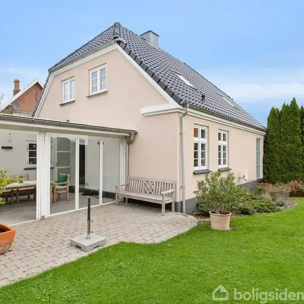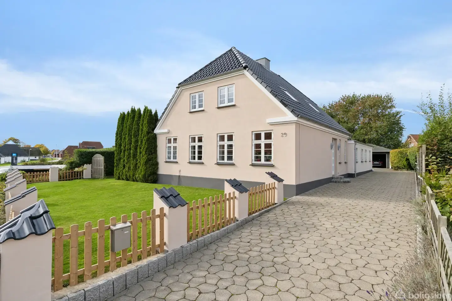 Et dejligt hus – så enkelt kan det siges. Bovvej 29 forener klassisk stil med moderne bekvemmeligheder, en gennemført modernisering og en central beliggenhed midt i Padborg.Allerede ved ankomsten fornemmes den gode stemning: Den pæne facade og den velplejede forhave giver et flot førsteindtryk, mens den lange indkørsel leder jer frem til garagen med tilhørende værksted.Indenfor bydes I velkommen i en pæn entré med trappe til førstesalen. Herfra åbner boligen sig til et lyst og indbydende køkken-
