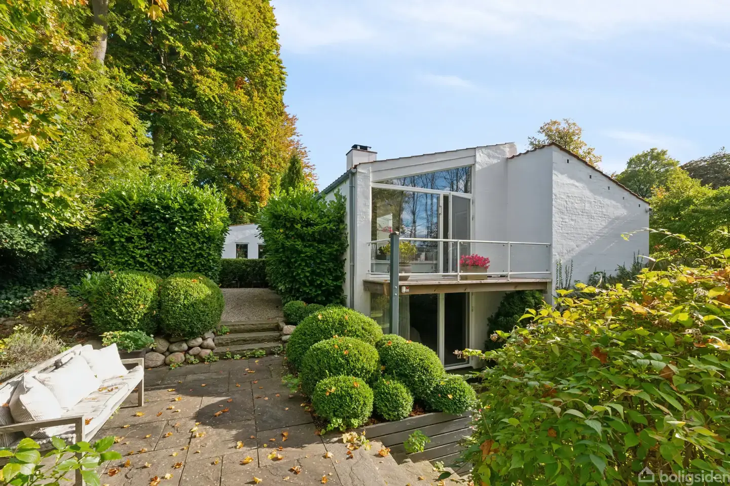 Arkitekttegnet villa i parklignende omgivelser. Midt i Birkerød ligger en klassisk, arkitekttegnet villa fra 1952 smukt placeret på en ugeneret, skrånende grund, der fører ned til en glitrende sø. Naturen er yderst nærværende på grunden, og haven minder om en park, hvor en rig variation af planter bidrager til den stemningsfulde atmosfære såvel som til følelsen af privatliv. Inde og ude får man lyst til at gå på opdagelse, idet både hus og have er dynamisk indrettet med særskilte rum og niveaufo
