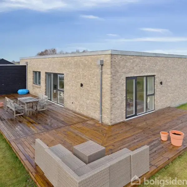 Glæd jer til hverdagen i denne gennemførte etplansvilla, der ligger i et dejligt nabolag i Funder. Her får I en moderne bolig fra 2025 med 130 m2 og gulvvarme i samtlige rum. Dertil venter jer troldtektlofter og skønne lysindfald, som tilsammen skaber en behagelig og stilren atmosfære.Ved ankomst parkeres bilen i carporten. Indenfor træder I ind i entréen, som leder jer ind i køkken-alrummet, hvor det flotte Svane-køkken tager imod. Køkkenet fremstår stilrent med elementer i en varm brun nuance,
