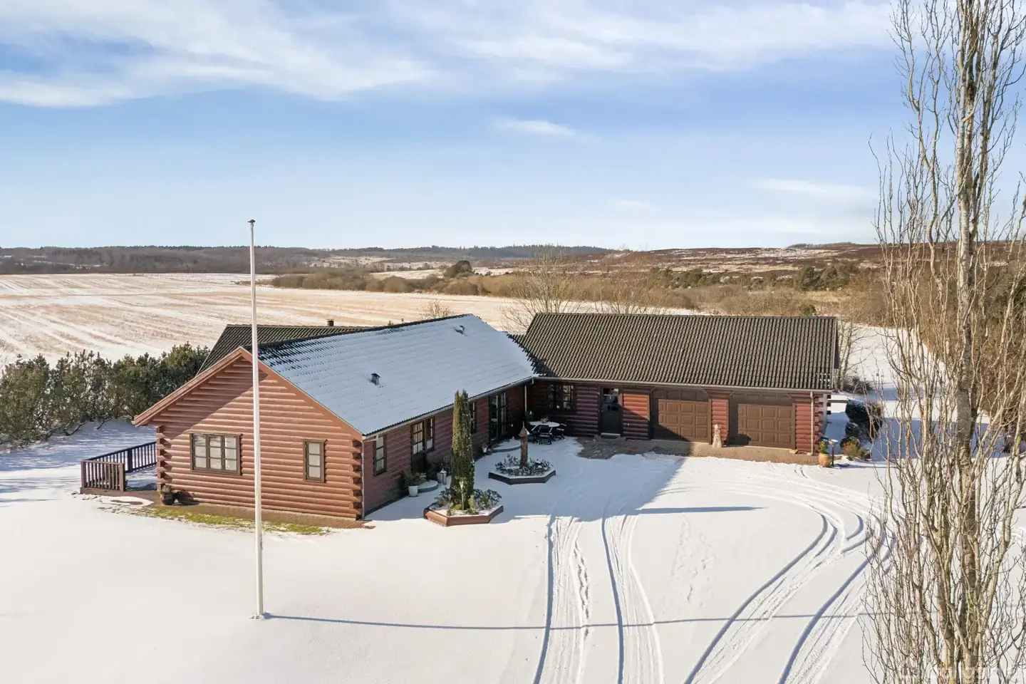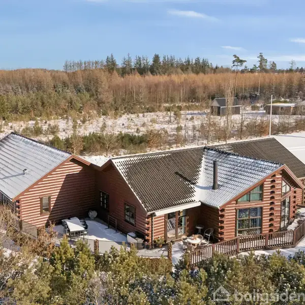 Midt i et naturlandskab præget af heder og skov syd for Holstebro ligger denne omfattende ejendom på en samlet grund på over 1,6 hektar. Der er tale om en dobbelt matrikel, der grænser op til Bærkær Bæk og det vidtstrakte hedelandskab, Kaj Munks Hede i Stråsø, hvor krondyr, bævere og harer blot er nogle af de dyrearter, der trives i nærområdet. Her erhverver man to selvstændige ejendomme. Bjælkehuset fra år 2000 rummer 172 kvadratmeter og er den primære bolig, mens murstensvillaen på den anden g