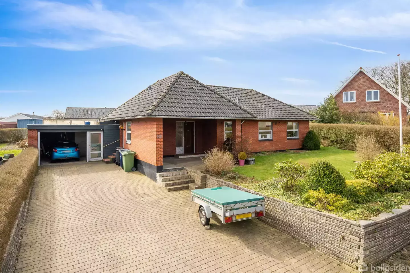 Nu kan I finde jer godt til rette i Bryndums trygge landsbymiljø, hvor denne nydelige rødstensvilla venter jer. I får fornøjelsen af en lys og velholdt ejendom, som har god plads til børnefamilien, og hertil hører en garage og et værksted samt en lukket, solrig have, hvor I kan nyde udelivet til fulde. Nærmiljøet tilgodeser også alle jeres behov. Stuen udgør husets primære opholdsrum, hvor dejlige lysindfald bidrager til den behagelige atmosfære, og der er også masser af plads til at indrette h