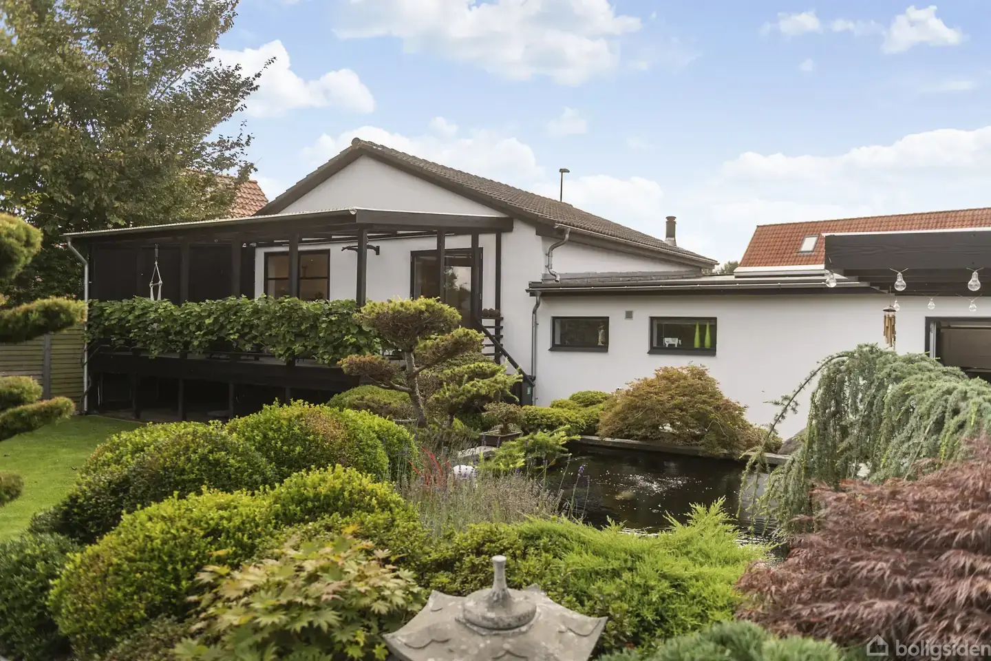 Stor garage, flot anlagt have med skønne terrassemiljøer, stort køkken/alrum og stue