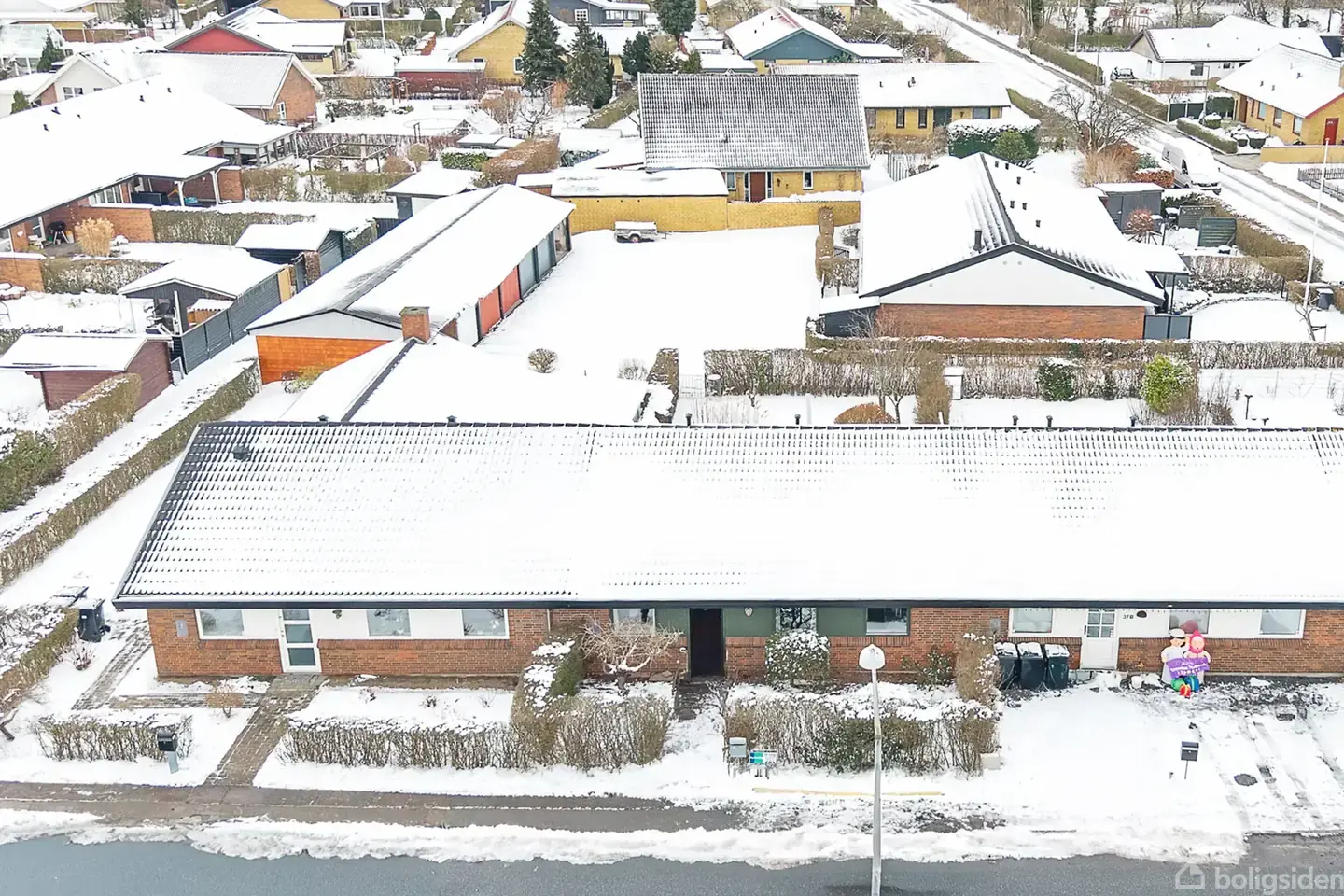 Rækkehus i ét plan på 100 m² med absolut overskuelig grund på 256 m² i et etablere og roligt kvarter. Dertil god garage på 20 m²Boligen byder på en praktisk planløsning med tre værelser og en stor stue, der samler dagligdagen.De store vinduespartier i stuen og spisekøkkenet sørger for et godt lysindfald, og her er mulighed for at skabe et hjem, hvor rummelighed og funktionalitet går op i en højere enhed.Placeringen nær busstoppested og med skole og daginstitution tæt på gør hverdagen nem for fam