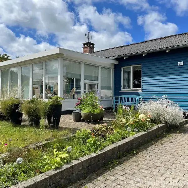 Åbent hus med tilmeldingskrav 3/2 - klik på billede - I Vemb finder du dette charmerende hus, der straks fanger blikket med sin petroleumsblå træfacade, hvide vinduer og eternittag. Dertil hører en stor garage og værksted i samme stil, som giver plads til både hobby og opbevaring. Haven er anlagt som et ”vildt med vilje”-miljø med terrasser og lækroge, hvor man kan nyde solen og den fantastiske udsigt over Storådalen dagen igennem. Indenfor byder huset på en praktisk baggang med adgang til viktualierum, et lyst snedkerkøkken med spiseplads og en dejlig opholdsstue med parketgulv og udgang til den sydvendte udestue. Badeværelset er moderniseret i 2015 med elgulvvarme, fliser og glasstensbruseniche, og derudover findes både soveværelse og værelse samt en mellemgang med gode skabe. Den sydvendte udestue er totalrenoveret og indrettet med klinkegulv og store vinduespartier, som sikrer et vidunderligt lysindfald og en betagende udsigt over Storådalen. Lyset fra udestuen strømmer videre ind i stue og køkken, hvor selv en åbning i den sydlige væg lader solens stråler finde vej helt ind i husets hjerte. Storåen slynger sig tæt forbi ejendommen, blot omkring 100 meter fra huset, og her er der fine muligheder for lystfiskeri i naturskønne omgivelser. Som køber kan man blive medlem af den lokale lystfiskerforening og nyde godt af åens rige liv. Da ejendommen ikke er pålagt bopælspligt, er den samtidig oplagt som et fristed for hobbyfiskeren, hvor morgenkaffen kan nydes i udestuen, før dagens første kast gøres i åen. Vemb er en aktiv by med et stærkt lokalsamfund, hvor man finder både Dagli’Brugsen, skole, daginstitutioner, forskellige butikker og gode oplevelser i naturen. Samtidig er der kort køre- og togafstand til både Holstebro og Lemvig, hvilket gør beliggenheden både praktisk og attraktiv.