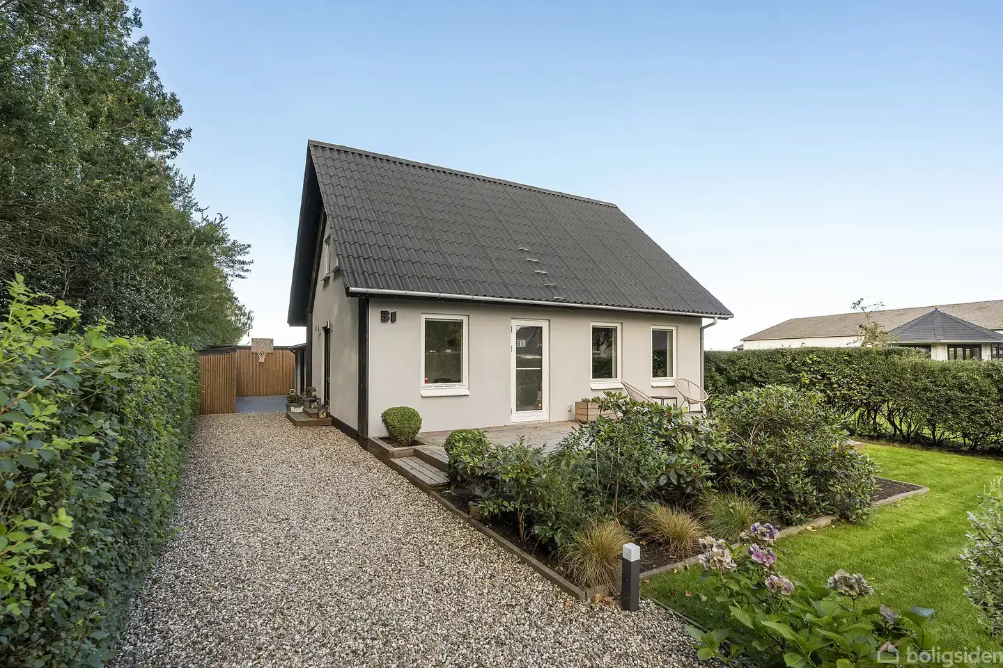 Allerede ved ankomsten til Bystævnevej 31 i Aborg mærkes den særlige ro og autentiske charme, der præger dette indbydende hjem. Ejendommen er beliggende fredeligt i naturskønne omgivelser, hvor stilheden kun afbrydes af naturens egne lyde. Indkørslen og den velholdte facade byder velkommen og skaber det første indtryk af den imødekommende atmosfære, som huset rummer. Her forenes hjemlighed og velvære på smukkeste vis. Når du træder indenfor, mødes du af et gennemrenoveret hjem, hvor nøje udvalg