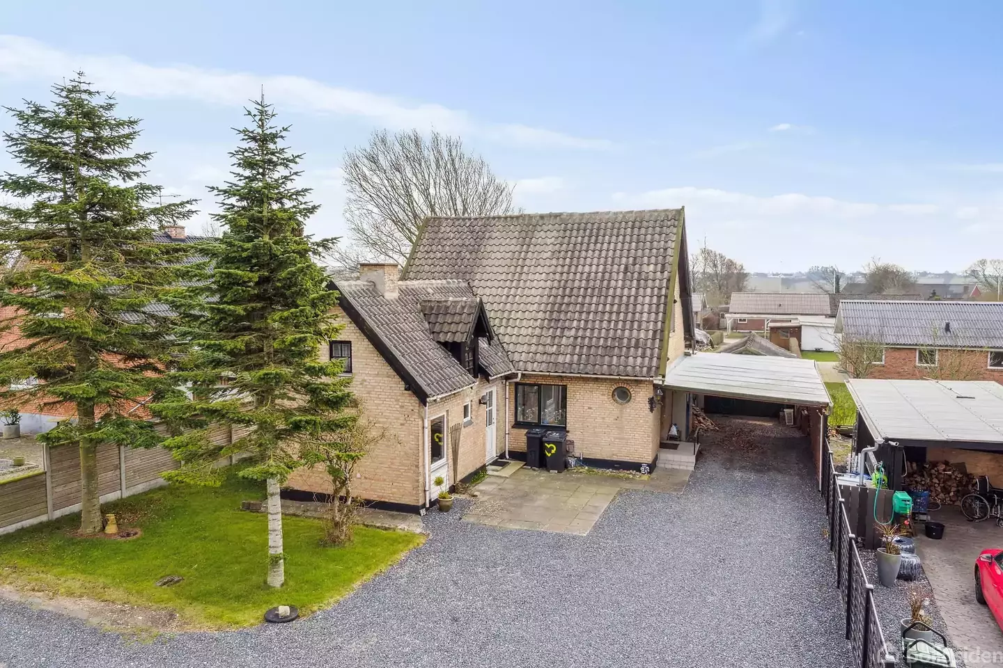 Velkommen på Byvejen!Vi ankommer til ejendommen via en flot grusbelagt indkørsel, hvor der er god plads til parkering af flere biler. Huset har desuden en rummelig carport med tilhørende garage, hvor der både er plads til bil, opbevaring og der er et fint værksted. Til ejendommen hører en stor og naturskøn grund og have som er anlagt med forskellige grønne arealer med diverse træer, buske og bede. Flotte omgivelser som kan nydes året rundt fra diverse terrasser samt drivhuset. Opholdsarealerne e