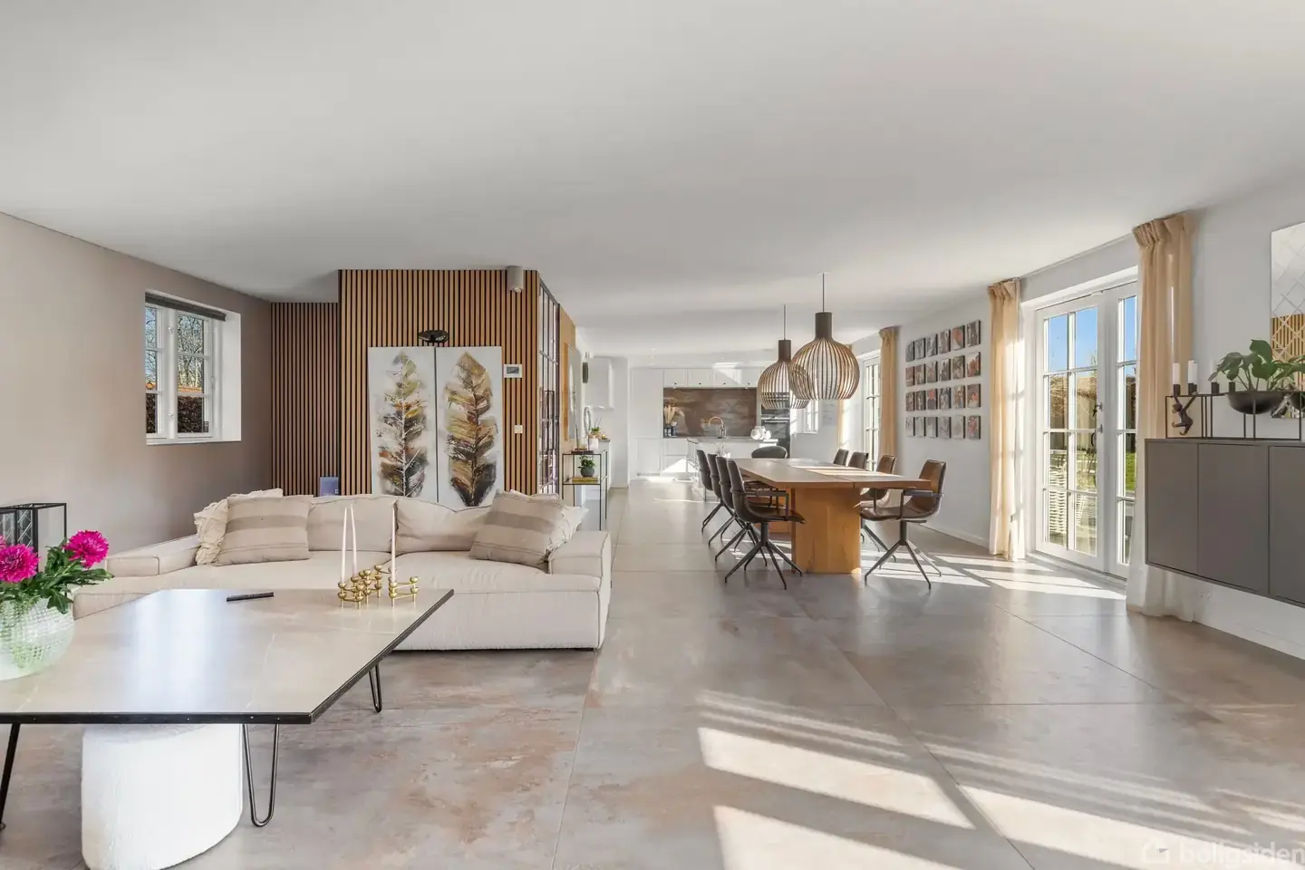 Som taget ud af et boligmagasin – en smuk og stilfuld bolig midt i Kildebrønde landsbys fredelige rammer. Klassisk arkitektur med et moderne tvist, alt er nænsomt opdateret med blik for æstetik og kvalitet. Her er ikke gået på kompromis, men derimod skabt et hjem med både karakter og luksus. Du bliver mødt af et roligt og imødekommende landsbymiljø, hvor nærvær og naboskab trives side om side med åbne marker og grønne kig. Nærhed til både skole, børneinstitutioner og indkøb. Haven er anlagt til både liv og nydelse – med en stor nyanlagt terrasse i hele husets længde, hvor loungemøbler, udekøkken og grillområde skaber rammerne om de lange dage og aftner under åben himmel. På græsset er der plads til boldspil og kroket, mens flaget vejrer i vinden. Forhaven er nyanlagt med god plads til parkering, og med en garage i en klasse for sig – luksus med gulvvarme i de smukke klinkegulve samt med plads til det hele. I dag er den indrettet som træningsrum, men mulighederne står åbne. Der er noget særligt over boligen, hvor hver detalje er nøje udvalgt, og kvaliteten mærkes i alt, hvad du rører ved. Opført i 1998 og siden forvandlet med nænsom hånd – her er intet overladt til tilfældighederne. Et indbydende område, hvor stue, spisestue og samtalekøkken flyder ud i ét og danner den naturlige ramme om både hverdagsliv og gæstebud. Tre dobbelte franske døre åbner mod terrassen og slipper lyset ind i rummene. De store smukke italienske klinker breder sig ud over gulvet og møder den flotte Dekton-bordplade, der fortsætter op bag komfuret. Køkkenet fremstår lyst og lækkert med hvide fronter, vitrineelementer og fine messingdetaljer. Saml familien om langbordet og lad måltiderne strække sig ind i de lange aftentimer. Ved siden af åbner døren til et ekstraordinært vinrum – et rum du kan træde ind i, hvor flasker og glas står klar i ro og orden bag den rå newyorkervæg. Stueområdet indbyder til ro og samvær - plads til både sofaer, bløde tæpper og levende lys. Et lille indhak fungerer som en oplagt krog til hjemmearbejde eller læsning. Gæstetoilettet er enkelt og stilfuldt med messing armatur fra Vola – en fin detalje, der passer ind i hjemmets gennemførte udtryk. Trappen med glasgelænder leder op til værelsesafdelingen, hvor en lys repos med indbygget bænk inviterer dig til at sætte dig og nyde freden og kigget ud gennem kvisten. Heroppe venter tre værelser og en særlig stemning med sildebensparket, lofter til kip, frie hanebånd og kviste, der lader lyset danse gennem rummene. I soveværelset åbner en fransk altan mod det fri – her kan du lade døren stå på klem og mærke morgenluften, der blidt vækker dagen. Badeværelset fra Invita fuldender etagen med sit eksklusive udtryk – dobbelte håndvaske, rainshower og igen messingarmaturer fra Vola, mens varme i væggen sørger for lune håndklæder, når du træder ud. Hele huset er tænkt til at gøre livet både smukkere og lettere – med Genvex, BWT-anlæg og intelligent lysstyringssystem. Her er der tænkt over det hele - det mærker du med det samme, for mavefornemmelsen falder på plads, allerede før du træder ind.