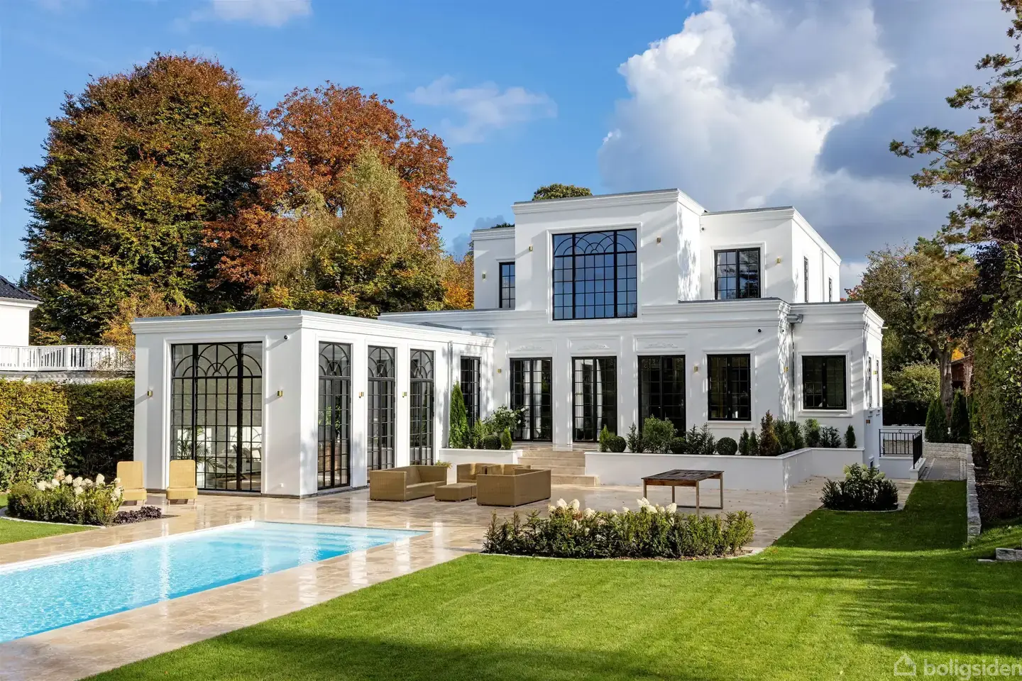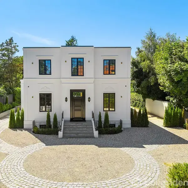 Imposant herskabsvilla med et smukt og sjældent set facadeudtryk i Danmark. Med inspiration fra de klassiske Townhouses i London får du her en unik og karakterfuld liebhaverejendom. Sjælden mulighed for en funklende ny villa i topklasse, opført i 2024. Yderst eftertragtet placering i det eksklusive lukkede kvarter mellem Skovmindevej og Dronninggårds Alle. Smukke villaer, høje gamle træer, roligt og fredfyldt samt i gåafstand til skole, S-tog, indkøb, skove og søer. Flot ankomstparti med plads til parkering af flere biler samt flot repræsentativ central trappe op til den sorte håndmalede gedigne hoveddør. Fuldendt med flot beplantning og elektrisk port. Ankomst i storslået hall med smukt kæmpe hall vindue mod nord. Yderst smukt udført svungen trappeløb til 1. salen og til kælderen. Dette store åbne hall rum giver en god connection mellem etagerne i villaen. Her er flot indbygget garderobeplads, gæstetoilet samt adgang til kontor i det nordøstlige hjørne. Mod syd forefindes spisestuen som har dobbelte døre til det kæmpe køkken/alrum og opholdsstuemiljø i eet stort rum. Skønne lysindfald fra de mange småsprossede døre og vinduer mod syd, vest og nord. Der er masser af plads til selskabelighed, repræsentation og familiehygge i det lækre køkken, hvor der også er plads til hverdags spiseplads. Opholdsstuen har skønt kig ud mod haven og pool området gennem de høje flotte døre samt til det store orangeri, som også kan benyttes til ekstra stor spisestue, når der fx er 30 gæster til fest. På 1. sal er der 2 store børneværelser med eget badeværelse samt kæmpe forældreafdeling med 2 walk-in closets, skønt badeværelse samt udgang til balkon. Der kan etableres et ekstra værelse i stedet for det ene walk-in, hvis et tredje børneværelse ønskes. En fantastisk kælder med ca. 2,6 meter til loftet og ligeledes gulvvarme overalt. Her er stort teenagerum, gæsterum, vinkælder, stort badeværelse med spa-stemning, endnu et toilet ved udgangsdøren til haven og poolen, depotrum, teknikrum samt den mest fantastiske vaskekælder du længe har set! Alt fremstår nyt, lækkert og indflytningsklart. Der er gulvvarme overalt og opvarmet med varmepumpe/jordvarme. Der er BWT anlæg, Quooker, etc. samt lækre materialer overalt, som forventes i denne kaliber. Haveanlægget er ligeledes færdigt og lækkert. Her er flot pool anlæg og store klassiske travertinfliser. Flotte solrige terrasser og god stor græsplæne til fodboldspil, etc. Der er udhus til pool udstyret, plads til cykel parkering, nydeligt tilrettelagt plads til affaldscontainere, mv. Kom og oplev en enestående villa og et skønt fredfyldt kvarter tæt på alle hverdagens nødvendigheder.